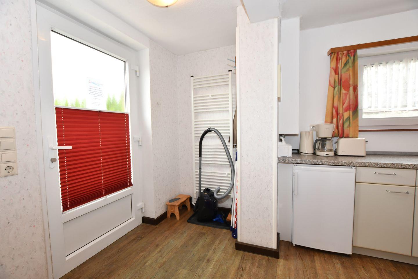 Diese geräumige Wohnung mit kleiner Terrasse (inkl. Gartenbestuhlung) hat einen gemütlichen Wohnraum mit einer großen Schlafcouch, Sat-TV mit Radio und ist optisch getrennt von der kleinen Küche mit Essplatz. Sie ist mit einem 4-Platten Herd, Backofen, Kühlschrank ohne Gefrierfach, Kaffeemaschine, Toaster, Wasserkocher, ausgestattet und verfügt über ausreichend Kochgeschirr. Ein Bad mit Dusche und WC vervollständigen das Bild. Eine Waschmaschine und Trockner sind im gemeinschaftlich nutzbaren Waschraum vorhanden.