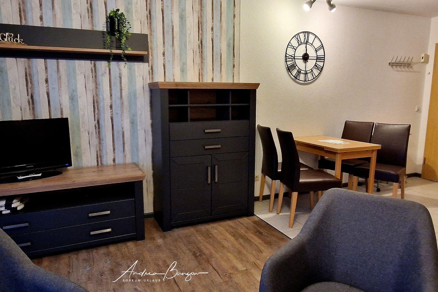Diese geräumige Wohnung mit einer nach Süden ausgerichteten Terrasse (inkl. Gartenbestuhlung) mit Blick auf den neuen Leuchtturm hat einen großen Wohnraum mit einer modernen Schlafcouch, Sat-TV mit Radio, kleiner Küche und Essplatz. Die Küchenzeile ist mit einem 4-Platten Herd, Kühlschrank ohne Gefrierfach, Kaffeemaschine, Toaster, Wasserkocher, ausgestattet und verfügt über ausreichend Kochgeschirr. Im Schlafzimmer können 2 Personen in einem Doppelbett schlafen und ein Tageslicht-Bad mit Dusche und WC vervollständigen das Bild. Eine Waschmaschine und Trockner sind im gemeinschaftlich nutzbaren Waschraum vorhanden. Ein Reise-Kinderbett und Hochstuhl für unsere jüngsten Besucher stellen wir Ihnen gerne kostenlos zur Verfügung.