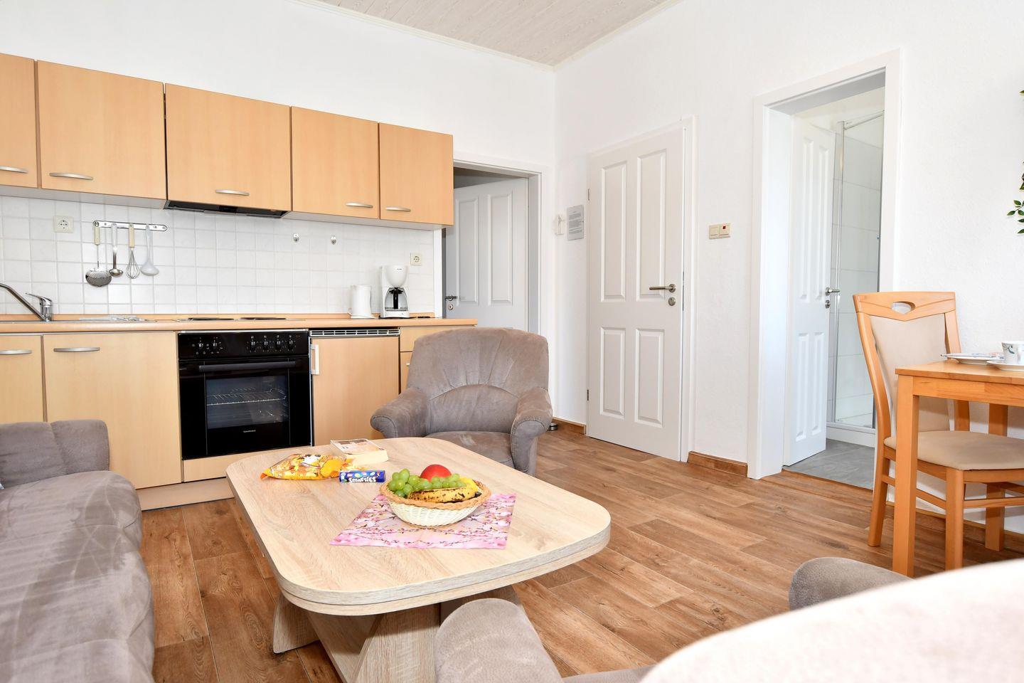 Schlafzimmer mit Doppelbett, Wohnzimmer mit Couch, gut ausgestattete Küchenzeile mit 4-Platten-Herd, Backofen, Kaffeemaschine, Toaster, Eierkocher etc., Essecke, TV und Radio.
