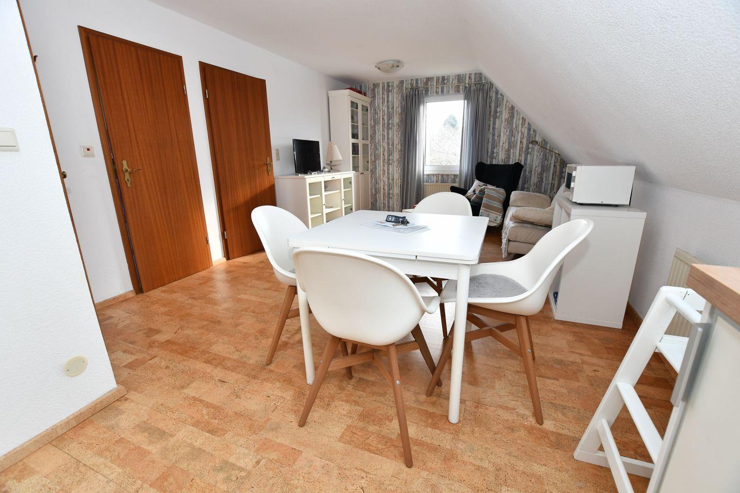 Essecke, TV mit Radio. Die Wohnung ist mit Korkparkett ausgestattet. Ein Kinderbett und Hochstuhl können kostenlos zur Verfügung gestellt werden.