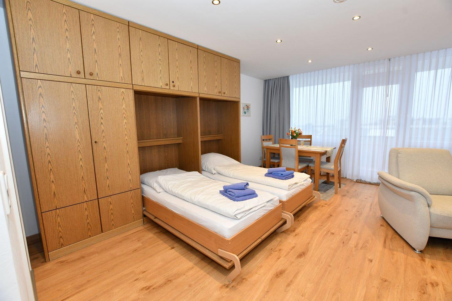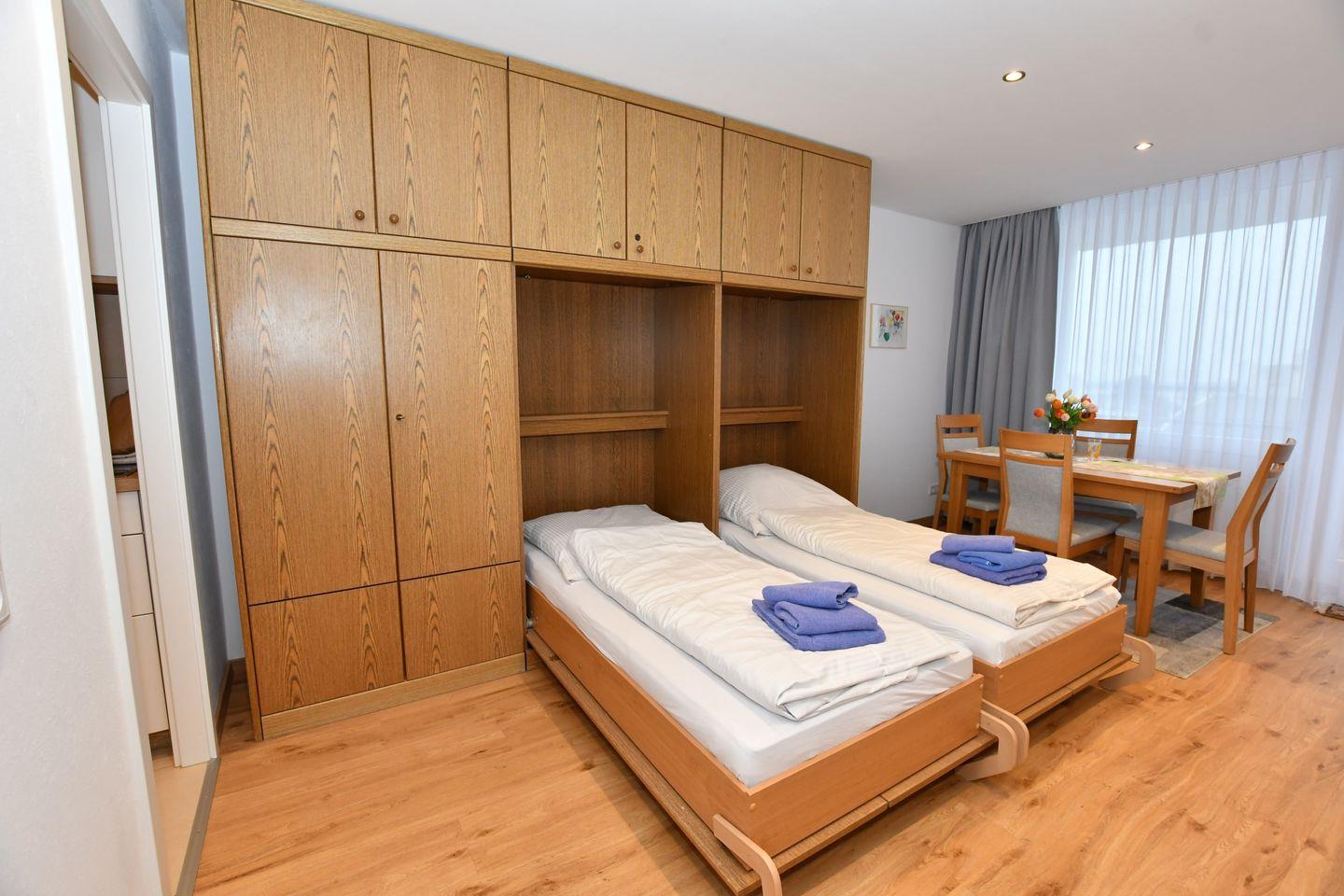 mit einem Wohnzimmer mit Schrankbetten,