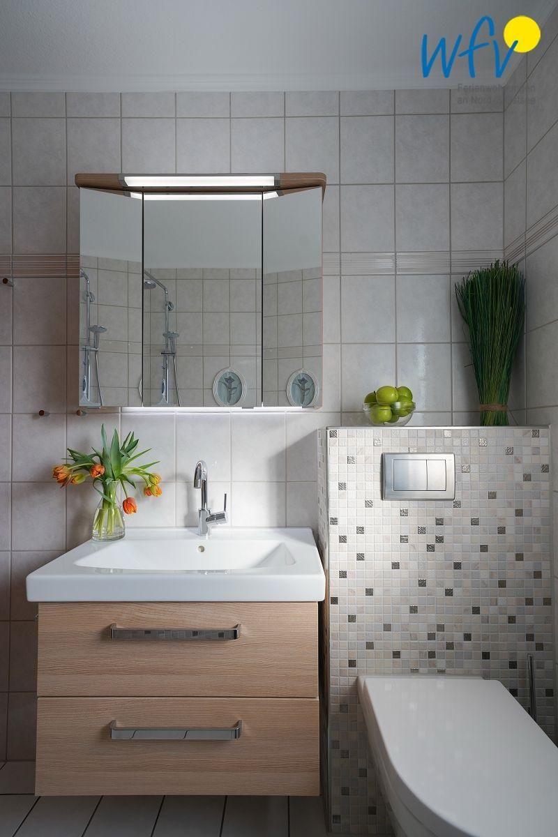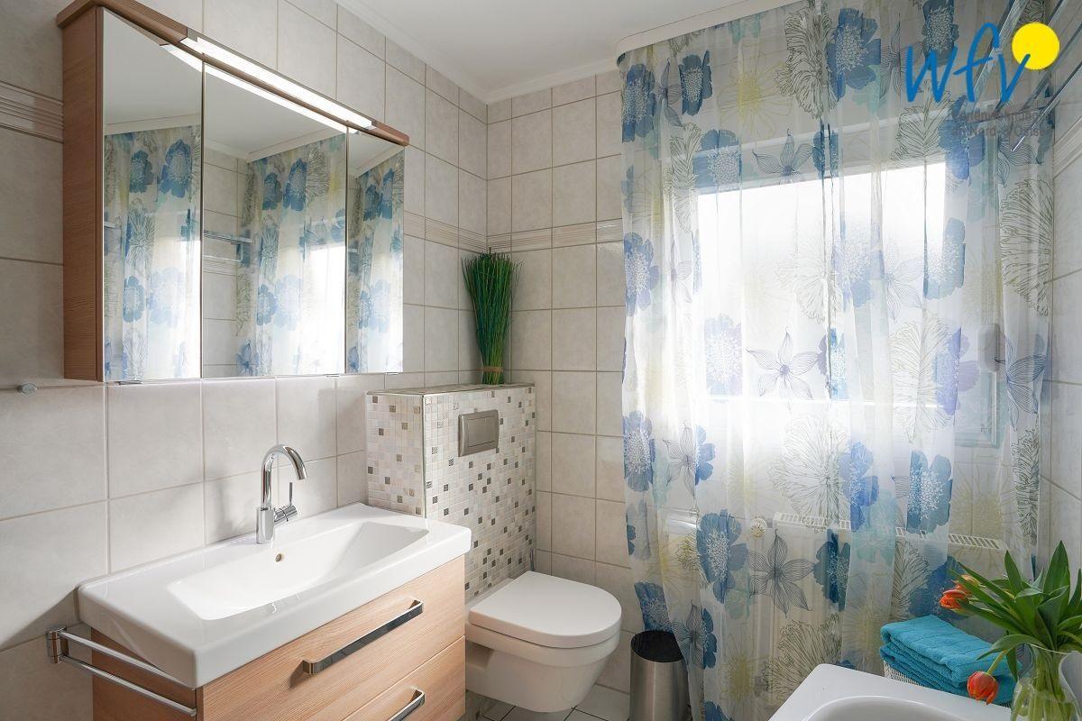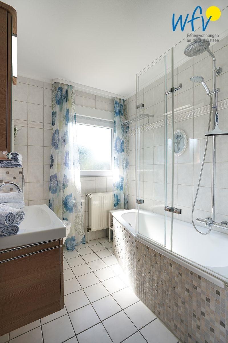 Auch im modernen Bad der Borkumer Ferienwohnung erwartet Sie Wohnkomfort - u.a. durch eine Kaldewei-Badewanne, eine spülrandlose Toilette mit komfortabler Sitzhöhe sowie durch eine 3-teilige hochwertige Hüppe-Glas-Duschabtrennung. Zur Sicherheit beim Duschen besitzt die Badewanne eine Antislipbeschichtung; der Duschkomfort wird durch die thermostatgeregelte Grohe-Badewannen- /Duscharmatur mit Hand- und Kopfbrause sichergestellt.
