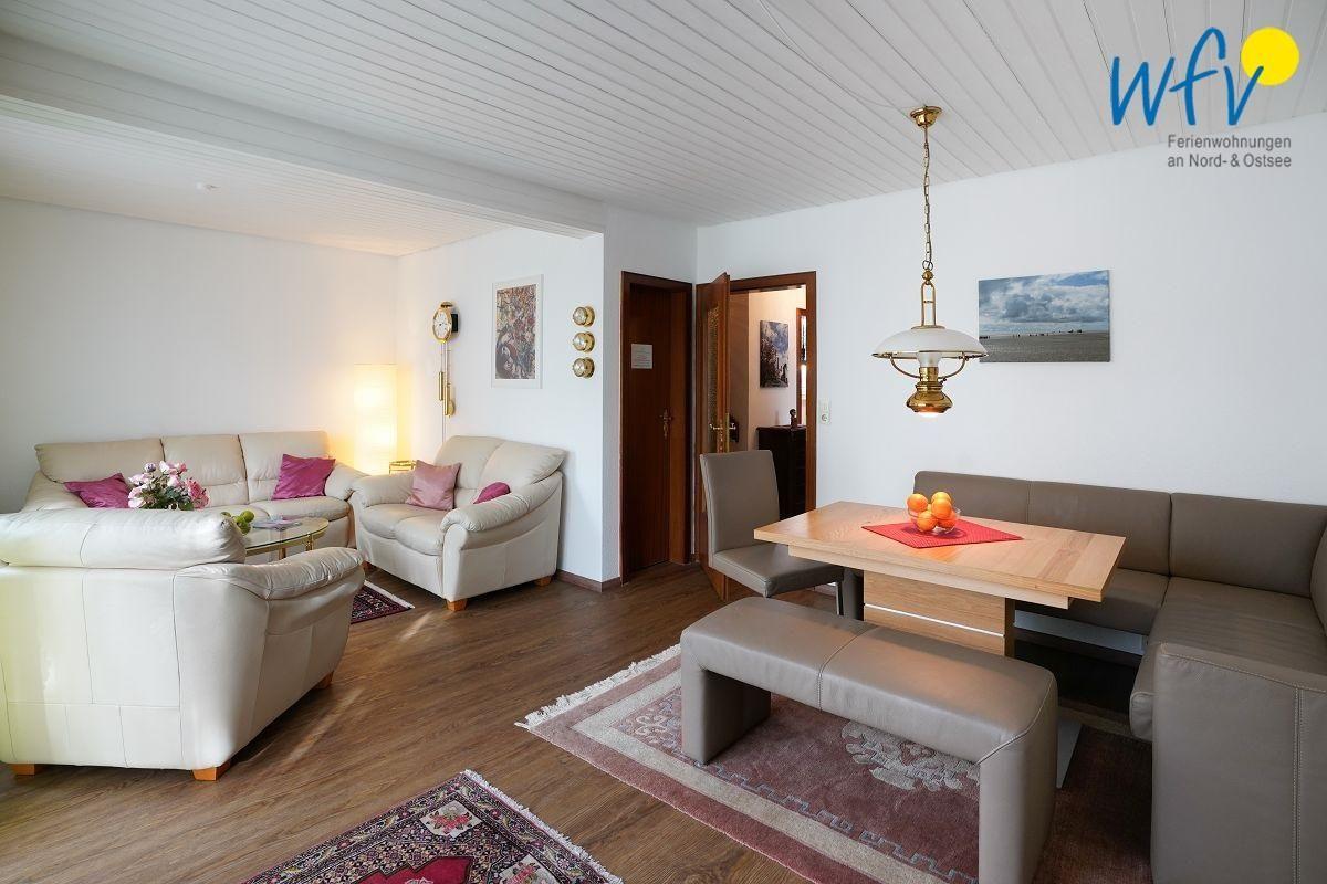 Der Wohnraum im Erdgeschoss wurde u.a. mit einer einladenden Essecke und einer bequemen Sitzgarnitur eingerichtet - jeweils mit pflegeleichten Dicklederbezügen - sowie mit einer guten technischen Ausstattung mit 55" Smart-TV, HiFi-Anlage inkl. Receiver, Video/DVD- und separatem CD-Player. Ein sehr gemütlicher Ort für gemeinsame Stunden!