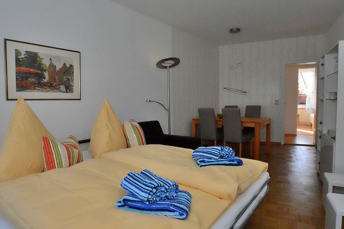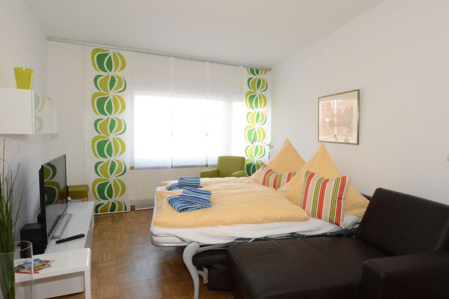 Auf ca. 45 qm werden Sie ein geräumiges Wohnzimmer mit Essecke zur Straßenseite ausgerichtet vorfinden, das moderne Ledersofa ist umgewandelt ein richtiges Bett für 2 Personen,