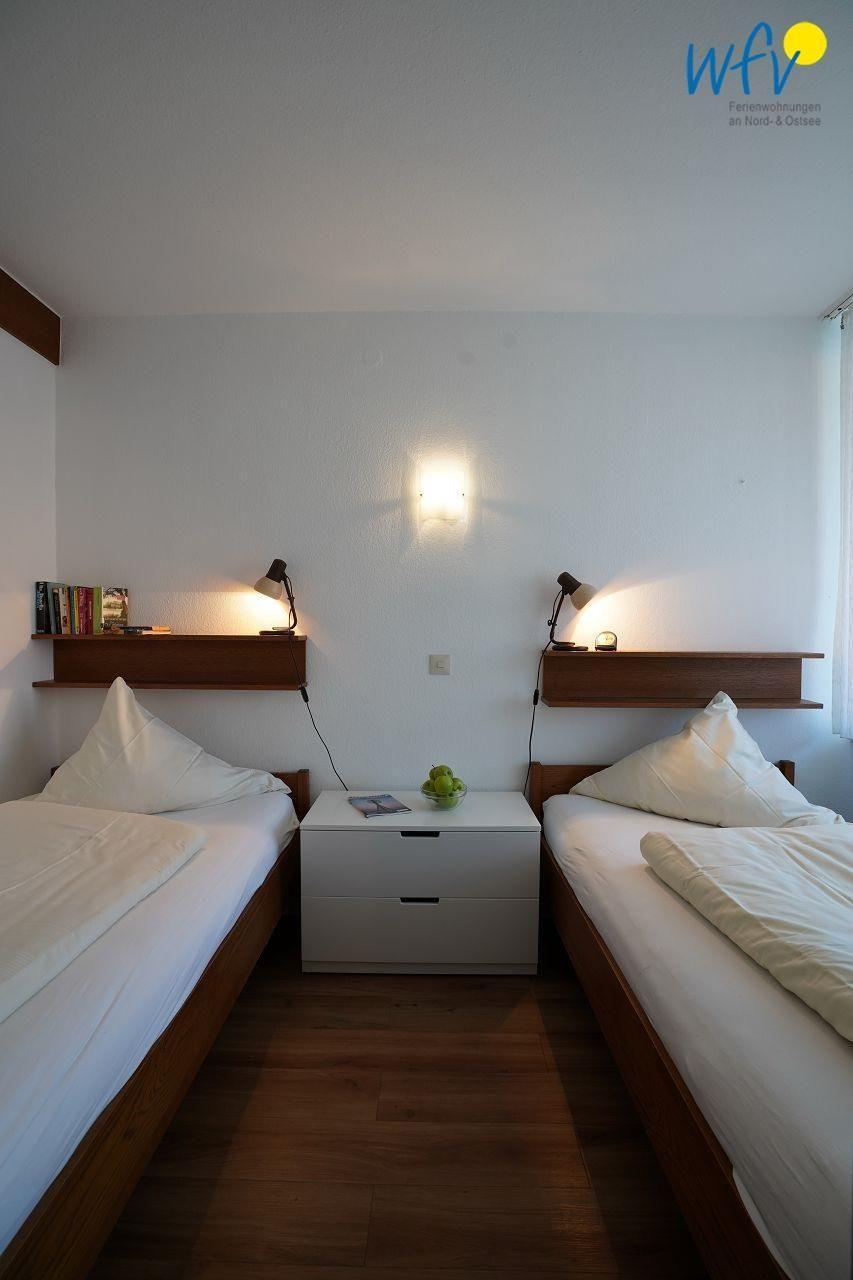 Zwei separate Schlafzimmer bieten Ihnen in der Ferienwohnung auf Borkum Platz für bis zu vier Personen. Eines der Schlafzimmer ist mit einem Doppelbett ausgestattet, das andere mit einem Etagenbett.