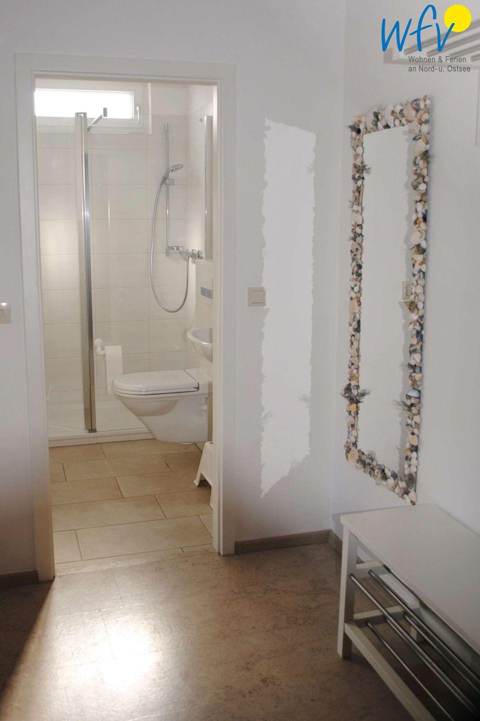 Im Flur gibt es ausreichend Platz für Ihre Sachen – inklusive Garderobe, Spiegel und Schuhbank. Ein kleiner Vorflur wird nur mit der Nachbarwohnung geteilt.