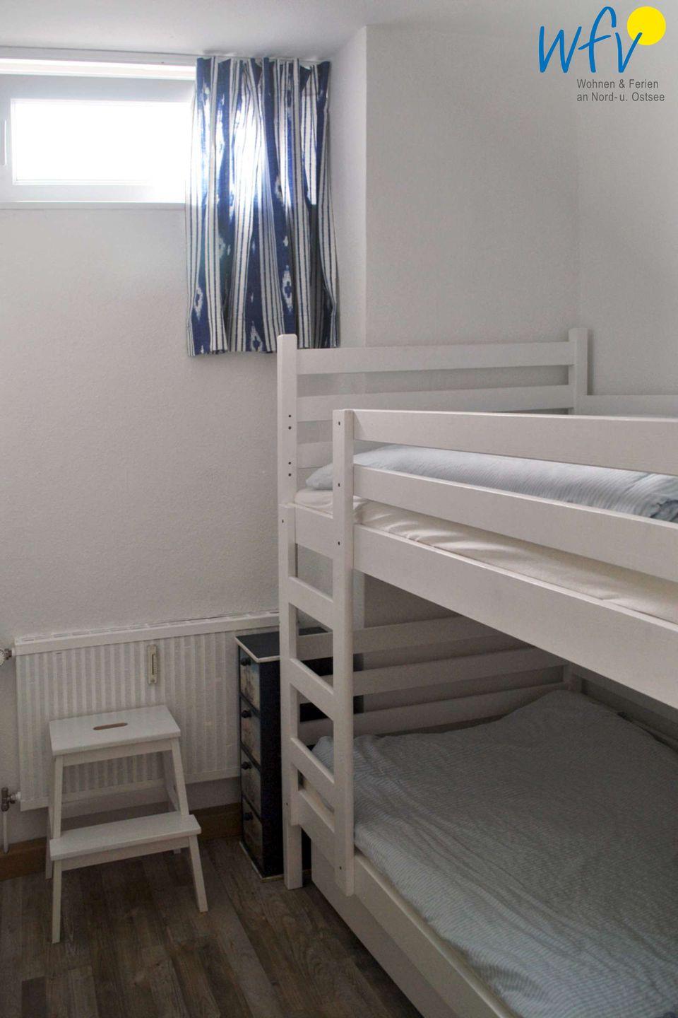Das separate Schlafzimmer ist mit einem Etagenbett (80 x 180 cm) ausgestattet, das ideal für Kinder ist. Ein Babybett und ein Hochstuhl sind im Aufklappteil des Sofas versteckt und lassen sich mit wenigen Handgriffen aufbauen.