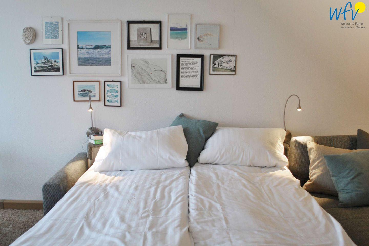 Der Wohn- und Schlafraum lädt mit einer großen Sofaecke zum Entspannen ein. Mit nur einem Handgriff wird das Sofa zu einem gemütlichen Doppelbett (165 x 200 cm) mit separater Matratze. Für entspannte Stunden sorgen außerdem ein Flachbild-TV, Gesellschaftsspiele, Bücher und ein Radio.