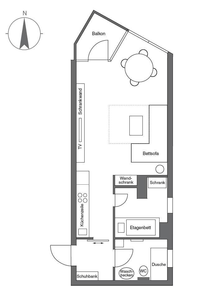 Unsere gemütliche Wohnung bietet Platz für zwei Erwachsene und zwei Kinder (+ ein Baby). Sie ist mit einem offenen Wohn- und Schlafraum, einer modernen Küchenzeile, einem separaten Kinderschlafzimmer, einem geräumigen Flur, einem stilvollen Duschbad und einem überdachten Balkon ausgestattet.