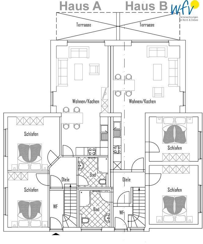 Sollten Sie mit max. 8 Personen anreisen, so können wir Ihnen auch gerne zusätzlich das Dachgeschoss anbieten. Hier befinden sich zwei weitere Schlafzimmer, ein Bad und ein Balkon: www.wfv-gmbh.de/4000002