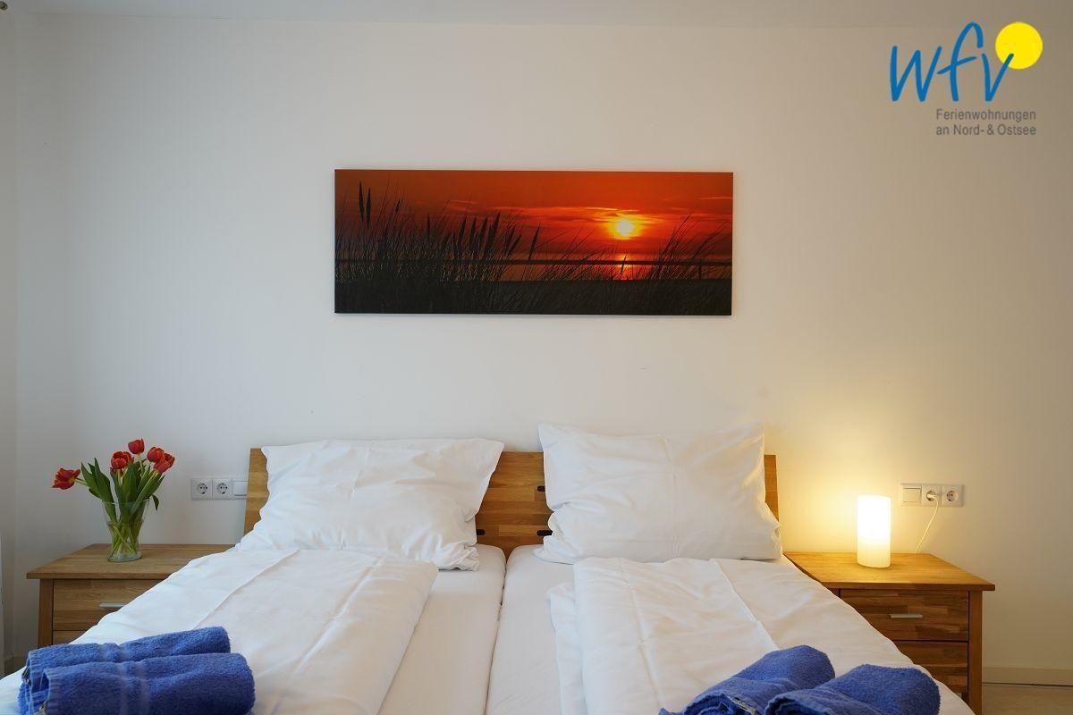 Die zwei separaten Schlafzimmer der Borkumer Ferienwohnung sind jeweils mit einem Doppelbett ausgestattet. Große Kleiderschränke und Kommoden sowie ein Flachbild-Fernseher vervollständigen die komfortable Ausstattung.