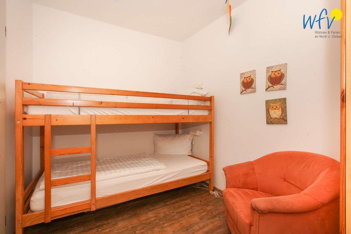 Eines der zwei separaten Schlafzimmer in der Borkumer Ferienwohnung ist mit einem Doppelbett und einem TV ausgestattet, das andere mit einem Etagenbett. Die Ledercouch im Wohnraum kann zu einer Schlafcouch (1,60 m x 2,00 m) ausgezogen werden.