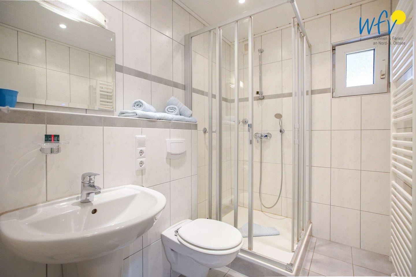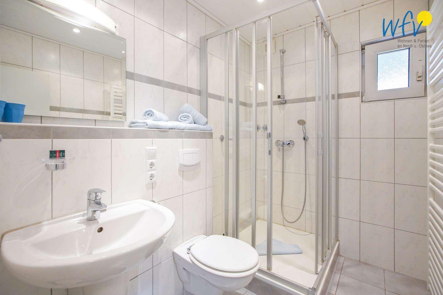 Das moderne Badezimmer verfügt über ein Waschbecken, ein WC und eine Dusche. Ausweichmöglichkeiten bestehen durch ein Gäste-WC. Ein Fön gehört zur festen Ausstattung der Ferienwohnung.