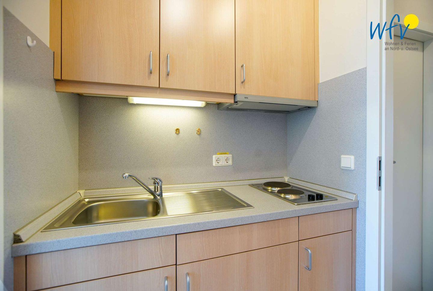 Die Küchenzeile mit kompletter Ausstattung (u.a. mit 2-Plattenherd, Kühlschrank mit Gefrierfach, Wasserkocher und Toaster) ermöglicht Ihnen eine bequeme Selbstverpflegung in Ihrem Urlaub auf Borkum. Kaffeegourmets kommen in den Genuss einer Senseo-Maschine.