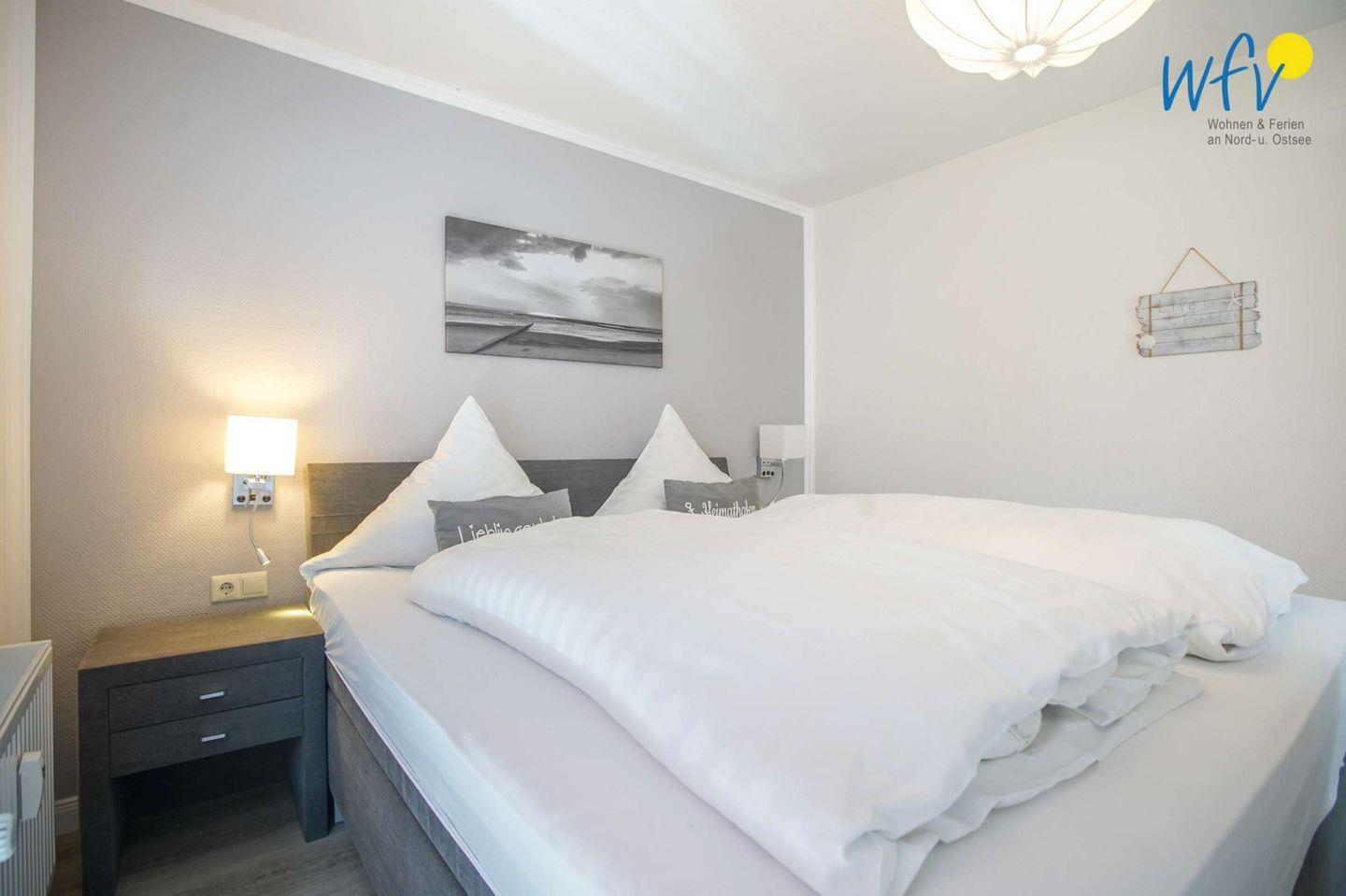 Das separate Schlafzimmer der Ferienwohnung auf Borkum ist mit einem bequemen Boxspringbett mit durchgehendem Topper in 180 cm x 200 cm ausgestattet. Schlafmöglichkeiten für zwei weitere Personen bestehen durch eine Schlafcouch im Wohnraum. Tagsüber bzw. in den Abendstunden können Sie in der gemütlichen Couchecke mit Fernseher, Radio und CD-Player natürlich auch gemeinsame Stunden mit der Familie verbringen.