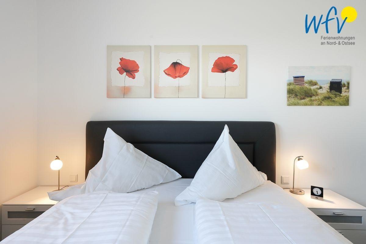 In dem separaten Schlafzimmer der Borkumer Ferienwohnung erwartet Sie ein komfortables Boxspringbett.