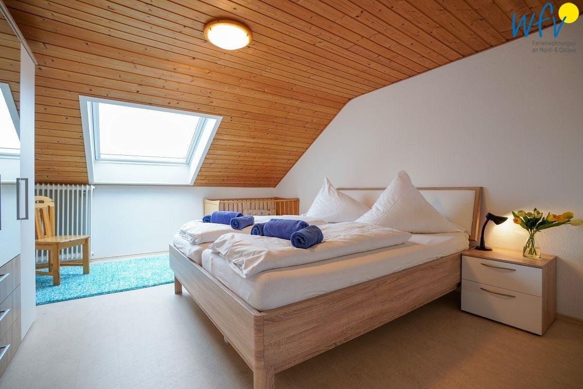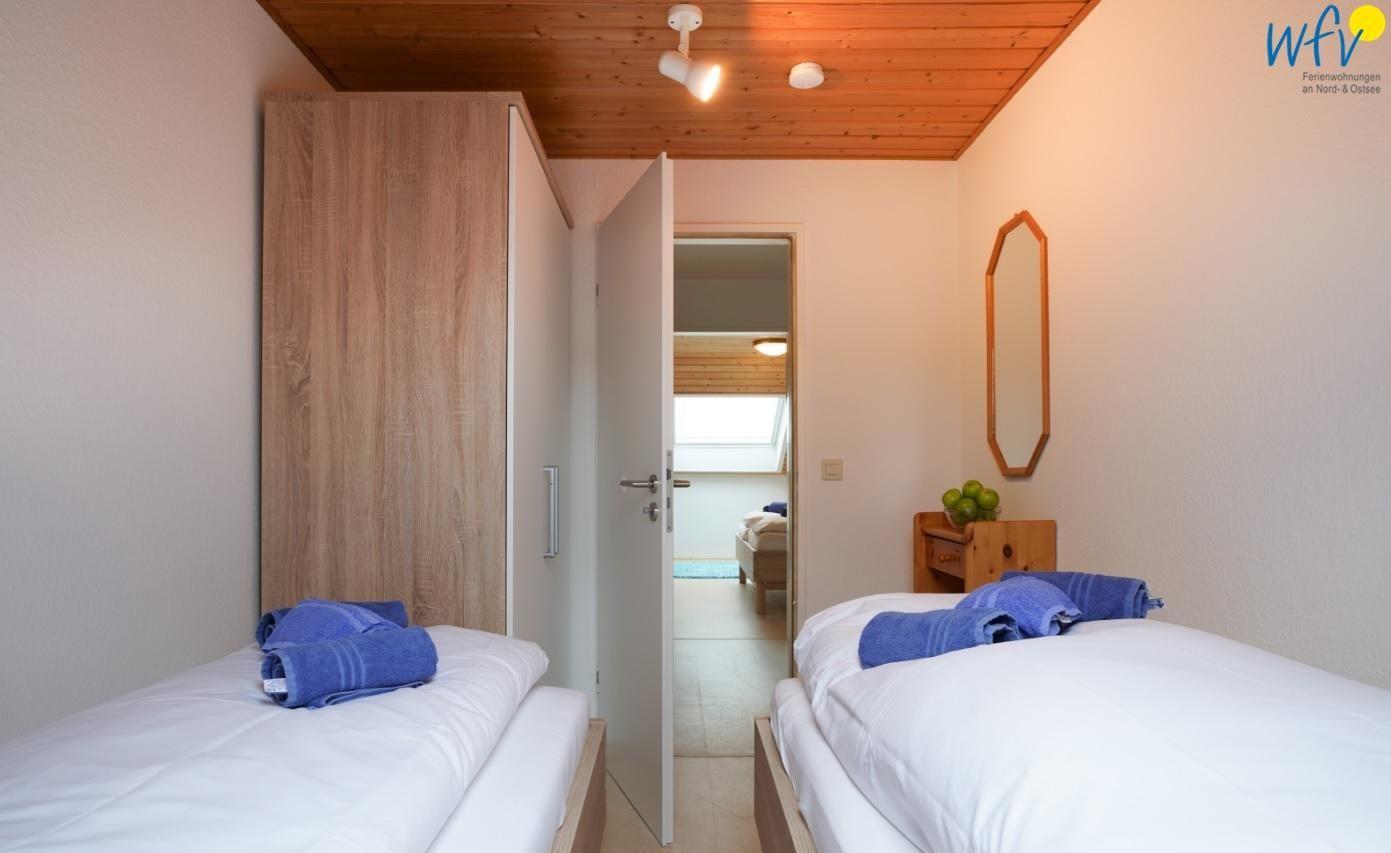 Die Borkumer Ferienwohnung verfügt über zwei separate Schlafzimmer. In dem geräumigen Elternschlafzimmer befindet sich ein Doppelbett sowie ein Kleiderschrank mit viel Stauraum. Auf Wunsch steht Ihnen ein Kinderbett zur Verfügung. Das Kinderzimmer ist mit zwei bequemen Einzelbetten (80x200 cm) und ebenfalls mit einem Kleiderschrank eingerichtet. Hübsche Holzverkleidungen an den Zimmerdecken machen die Räume besonders gemütlich.