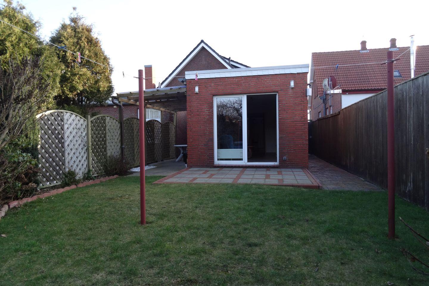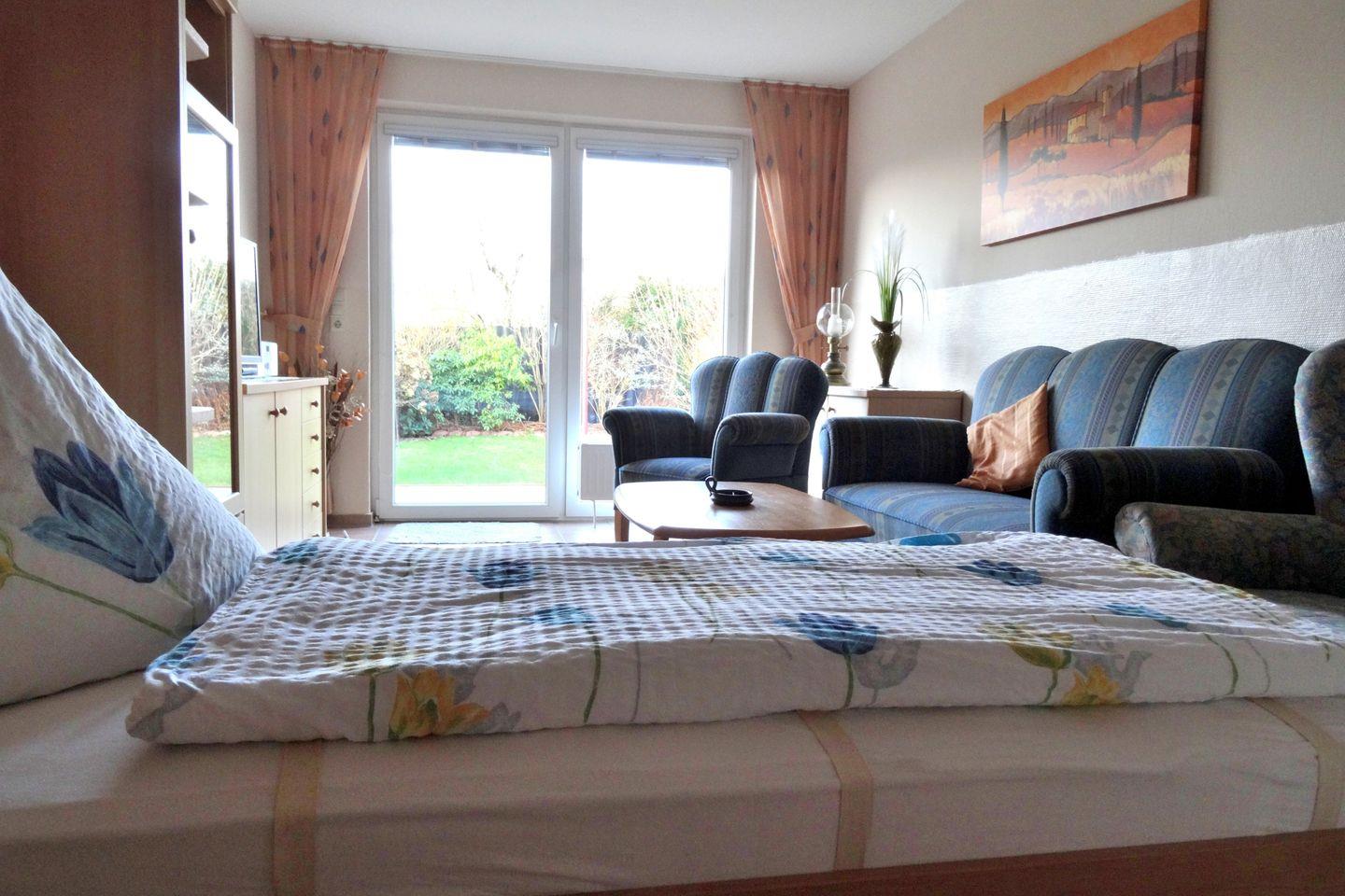 Durch einen kleinen Flur aus der Küche heraus mit Garderobe und Spiegel und dem Eingang zum Badezimmer mit Waschbecken, Dusche und WC gelangen Sie an die Hinterseite des Hauses und damit in das geräumige Wohnzimmer, welches mit einem Schrankbett für eine dritte Person ausgestattet ist. Natürlich befinden sich dort auch Sofa, Sessel und TV. Terrasse und ein kleiner Garten schließen sich hier an, in einem Strandkorb oder in Gartenmöbeln können Sie sich nach langen Spaziergängen wunderbar ausruhen. Der Garten ist dabei gut umzäunt und ganz für Sie allein, Ihre Kinder können ihn ungestört nutzen.
