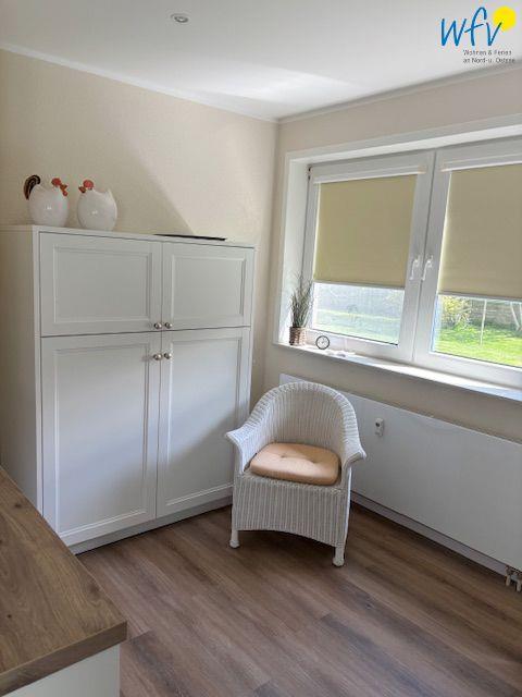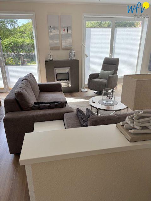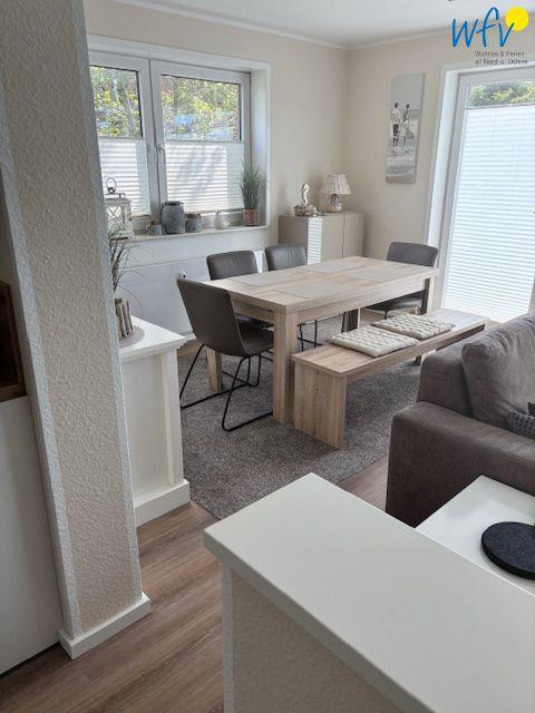 Nach der Fahrradtour oder dem Strandtag lädt der Wohnraum mit einem Ensemble aus großem Esstisch sowie Couchecke, Relaxsessel und modernem TV zum Entspannen ein. Ein sehr gemütlicher Ort für gesellige Film- und Spieleabende oder die entspannte Urlaubslektüre! Zum Surfen vom Smartphone aus empfangen Sie kostenlos freies WLAN.