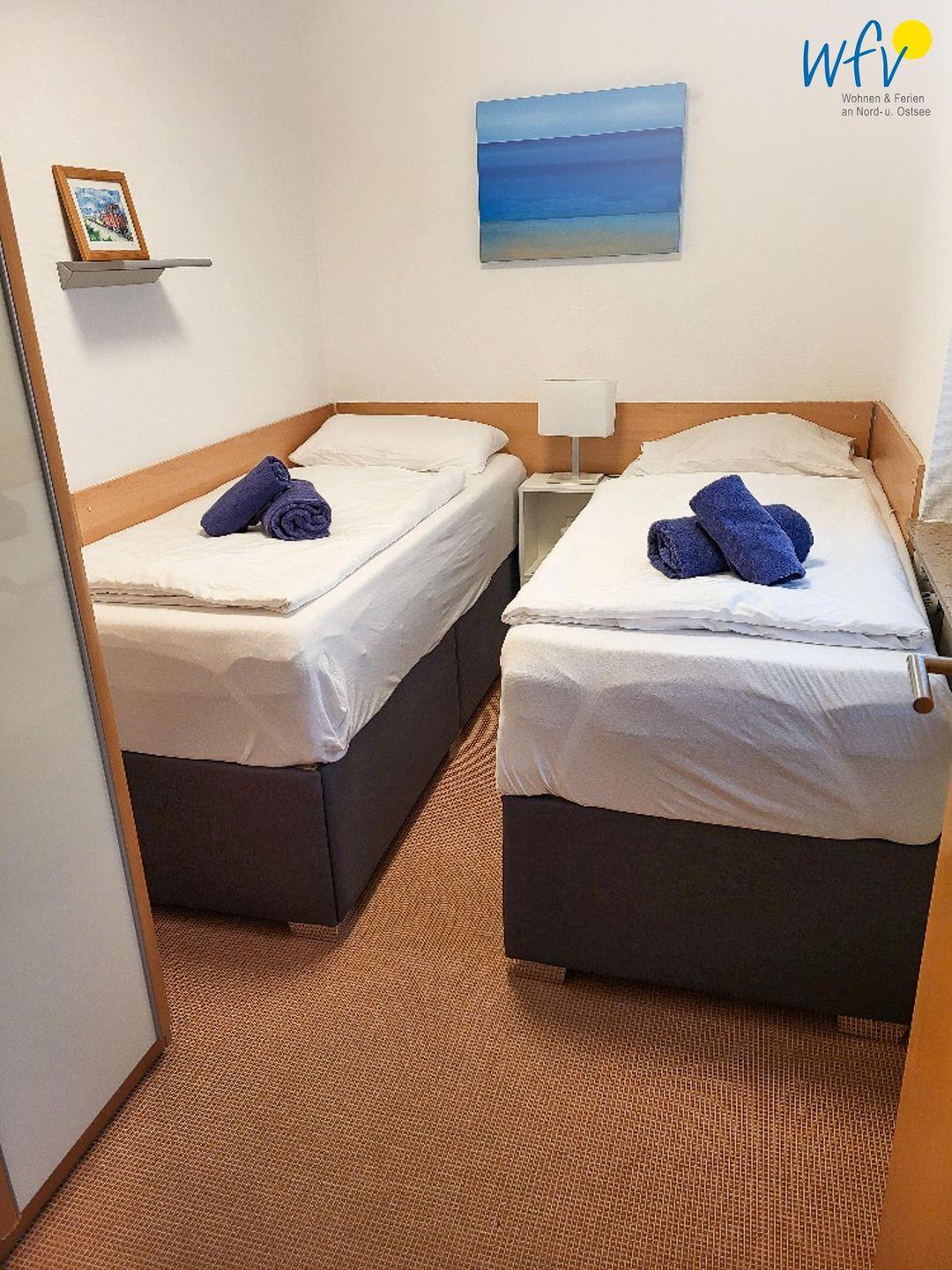In dem frisch renovierten separaten Schlafzimmer befinden sich zwei komfortable Einzelboxspringbetten (à 80 x 200 cm). Einen weiteren Schlafplatz bietet Ihnen die bequeme Schlafcouch im Wohnzimmer, welche versteckt im Inneren ein Bett (180 x 200 cm) mit Matratze offenbart und sehr leicht herzurichten ist. Auch ein Babybett gehört zur festen Ausstattung.