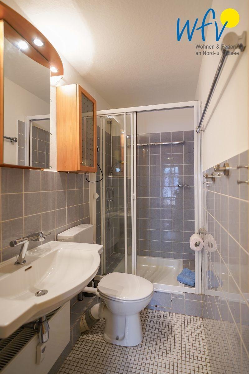 Das gepflegte Badezimmer wurde mit einer Dusche, einem Waschbecken und einem WC ausgestattet. Ein Föhn gehört zum festen Inventar.