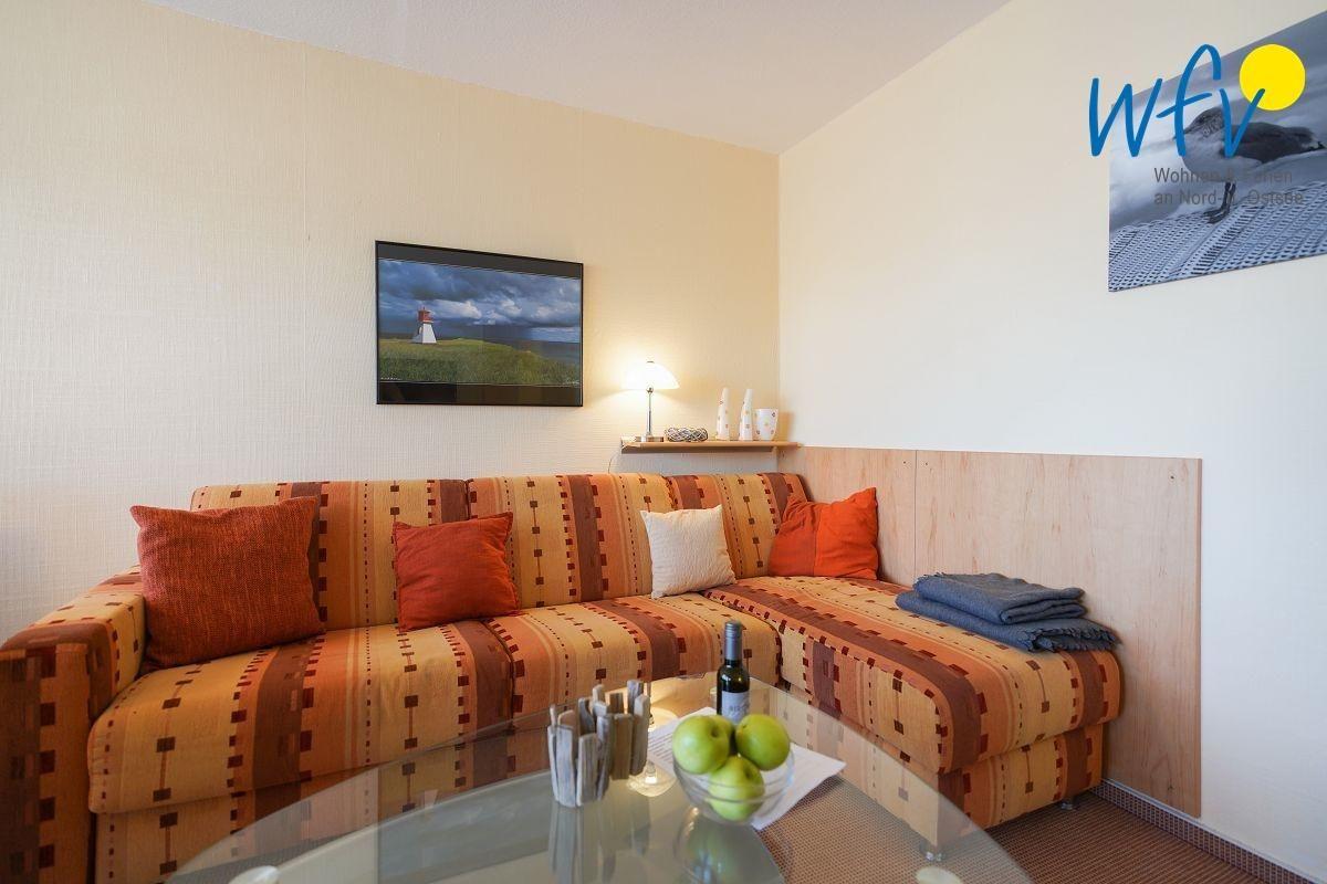 Herrlich entspannen können Sie auch im Wohnzimmer der Ferienwohnung. Es ist u.a. mit einer (Schlaf-)Couchgarnitur sowie mit einem Flat-TV, einem Blu-ray-Player und einer Stereoanlage eingerichtet. Das Zimmer ist ein heller, lichtdurchfluteter, zur Südseite gelegener Raum mit großer Fensterfront und direktem Zugang zum Balkon.