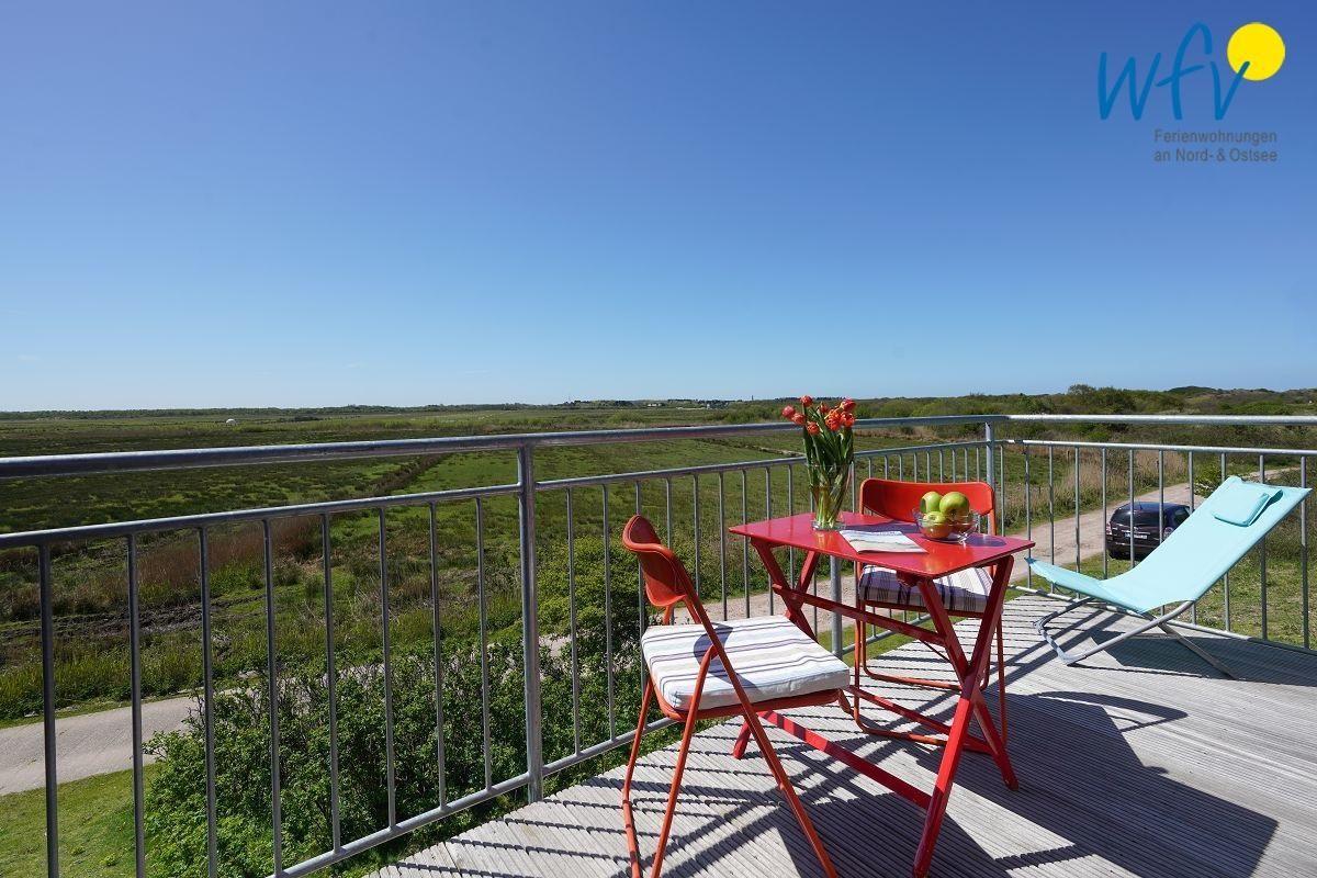 Zeit zum Ausspannen garantiert Ihnen auch der möblierte Balkon der Borkumer Ferienwohnung "Dünenoase"! Bei Sonnenschein, frischer Nordseeluft und einem spannenden Buch können Sie sich in vollen Zügen vom Alltag erholen. Von der Ferienwohnung aus haben Sie einen wunderschönen Ausblick - sowohl auf das Weideland, als auch auf die Dünenlandschaft.
