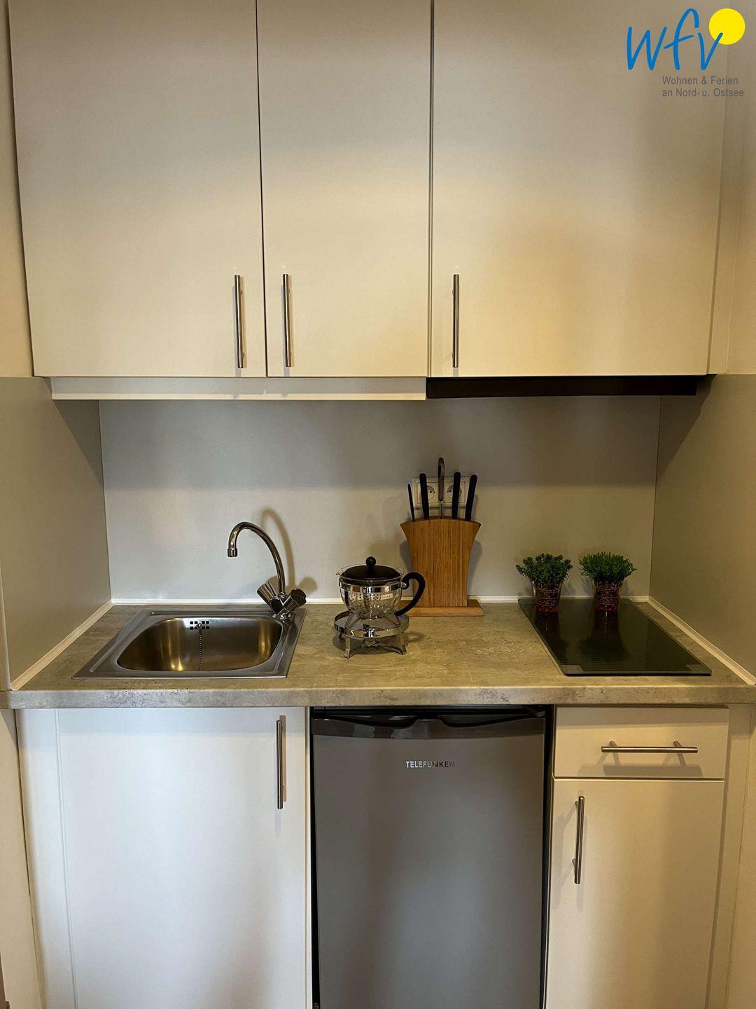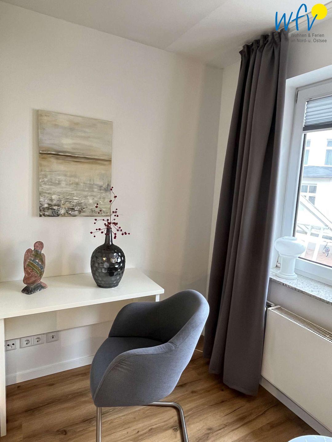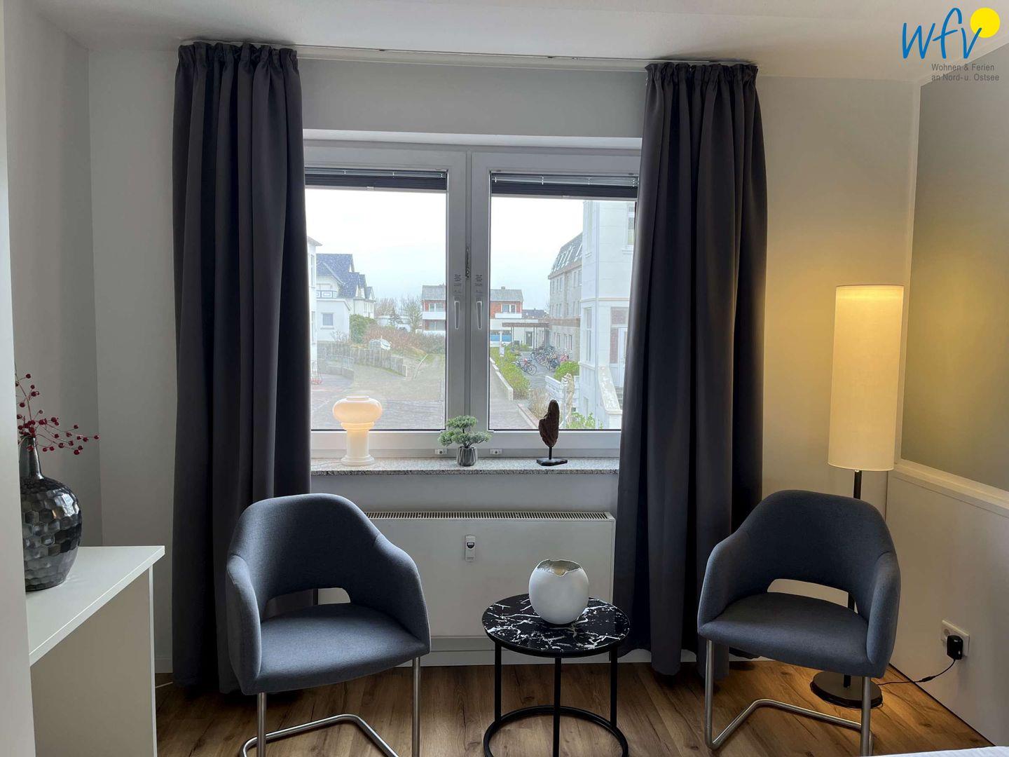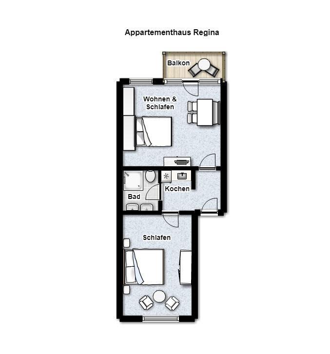 Das Ferienappartement befindet sich im ersten Stock des Hauses Regina, ist ca. 42 m² groß und verfügt über einen Wohnraum mit Essplatz, einen Flur mit integrierter Pantryküche, ein geräumiges Schlafzimmer sowie ein Duschbad und einem Balkon mit Blick ins Grüne. Zur Promenade und zum weitläufigen breiten Sandstrand sind es gerade einmal 70 m.