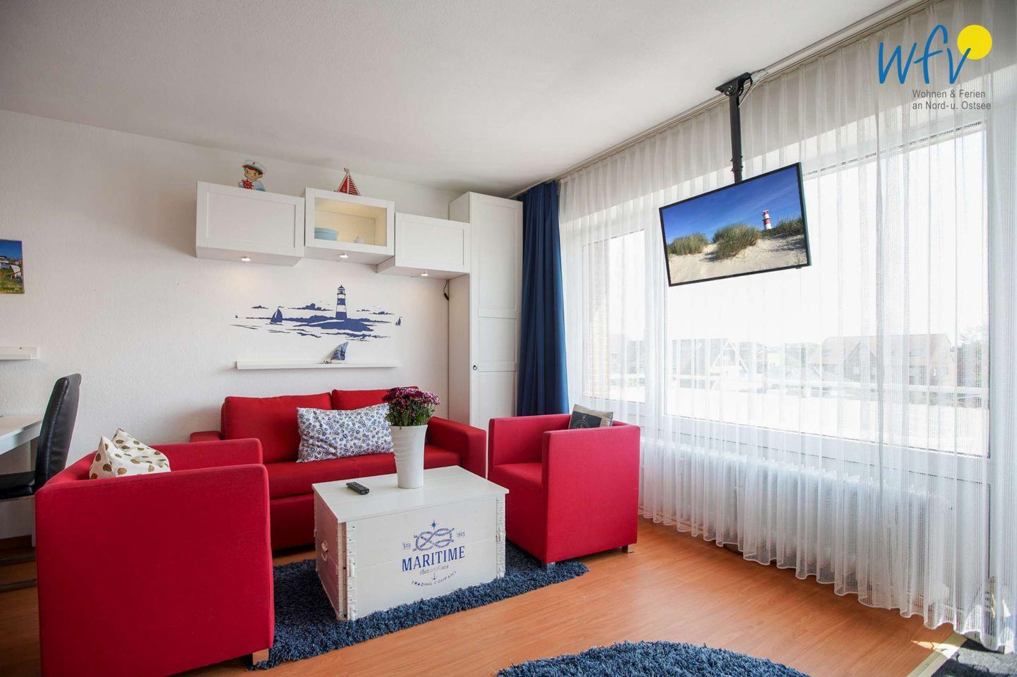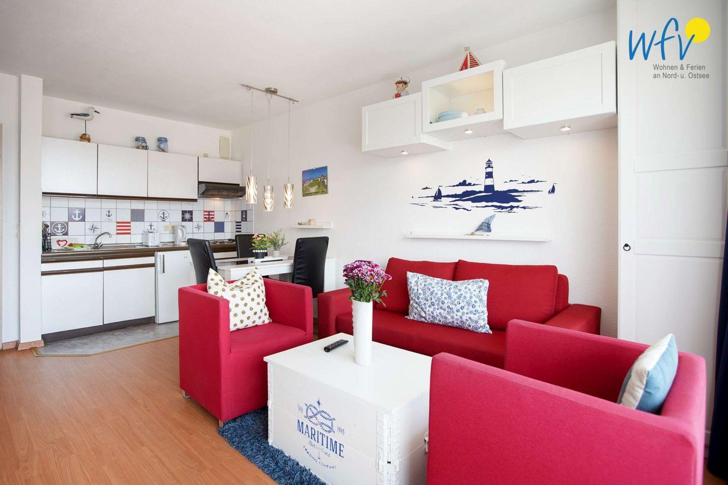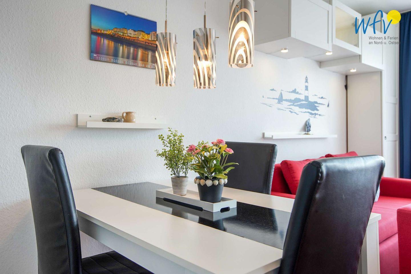 Es erwartet Sie ein komfortabler Wohnraum mit Couchecke, SmartTV und Video-on-Demand sowie Schlafmöglichkeiten für drei Personen und einer integrierten Küchenzeile mit Essbereich. Eine liebevolle Einrichtung und ein malerischer Blick auf den Leuchtturm machen die Ferienwohnung zu Ihrer persönlichen Wohlfühloase auf Borkum. Warme Sonnenstrahlen und klare Nordseeluft genießen Sie auf dem möblierten Balkon - perfekt für Mahlzeiten im Freien und zum ausgiebigen Ausspannen.