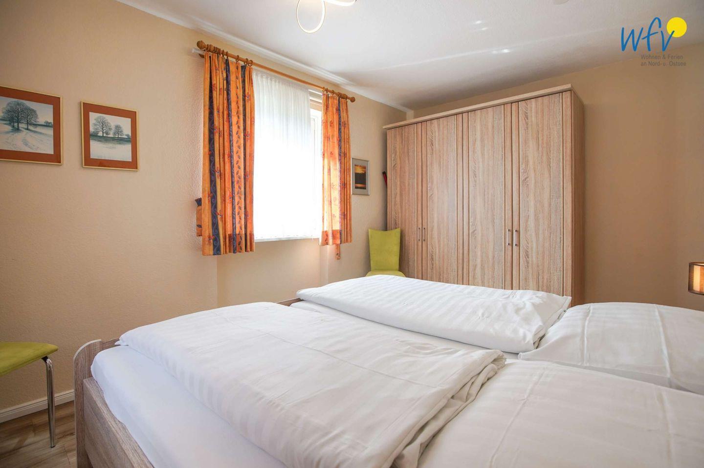 Im separaten Schlafzimmer der Ferienwohnung auf Borkum befindet sich ein Doppelbett und gerne kann auf Wunsch ein Kinderbett hinzugestellt werden.