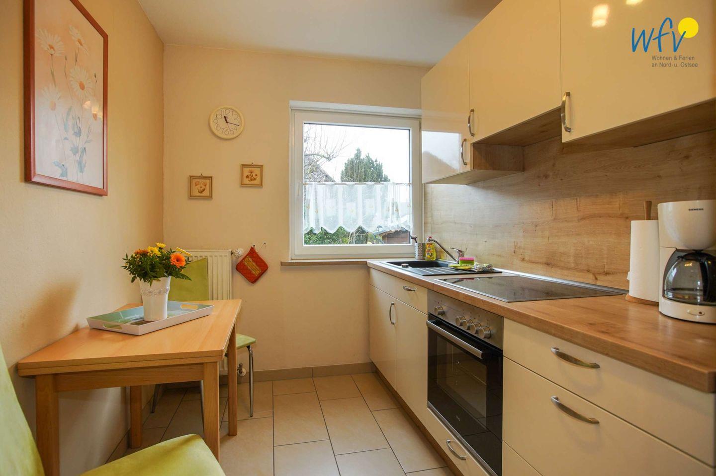 Die moderne geräumige Küche (u.a. mit Herd, Backofen, Kühlschrank, Mikrowelle, Spülmaschine, Kaffeemaschine, Wasserkocher und Toaster) bietet außerdem Platz für einen weiteren Esstisch. Neben der Selbstversorgung können Sie das kulinarische Angebot der nahegelegenen Restaurants im Borkumer Ortskern oder an der Promenade genießen - mit einem beeindruckenden Sonnenuntergang als Zugabe zum Abendessen.