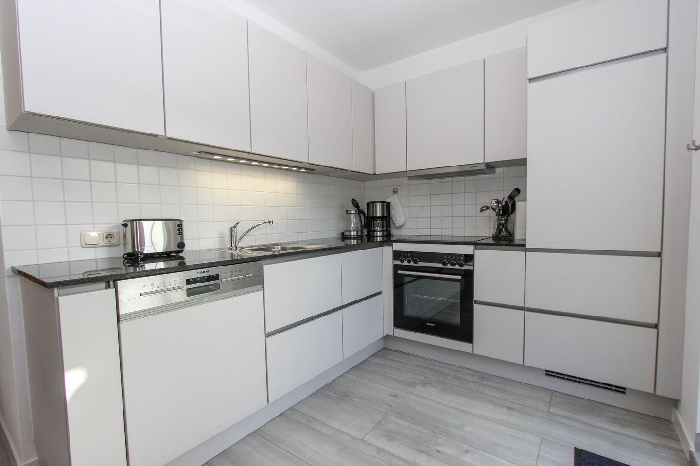 Die Wohnung befindet sich im Parterre und verfügt über ein komfortables Schlafzimmer sowie ein geräumiges Wohnzimmer mit einer offenen Küchenzeile. Die voll ausgestattete Küche verfügt über eine Spülmaschine.