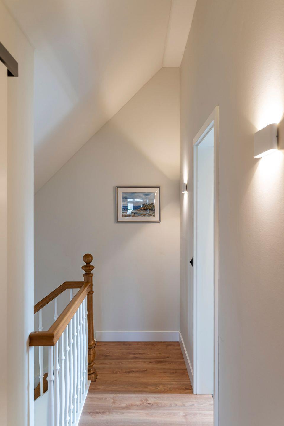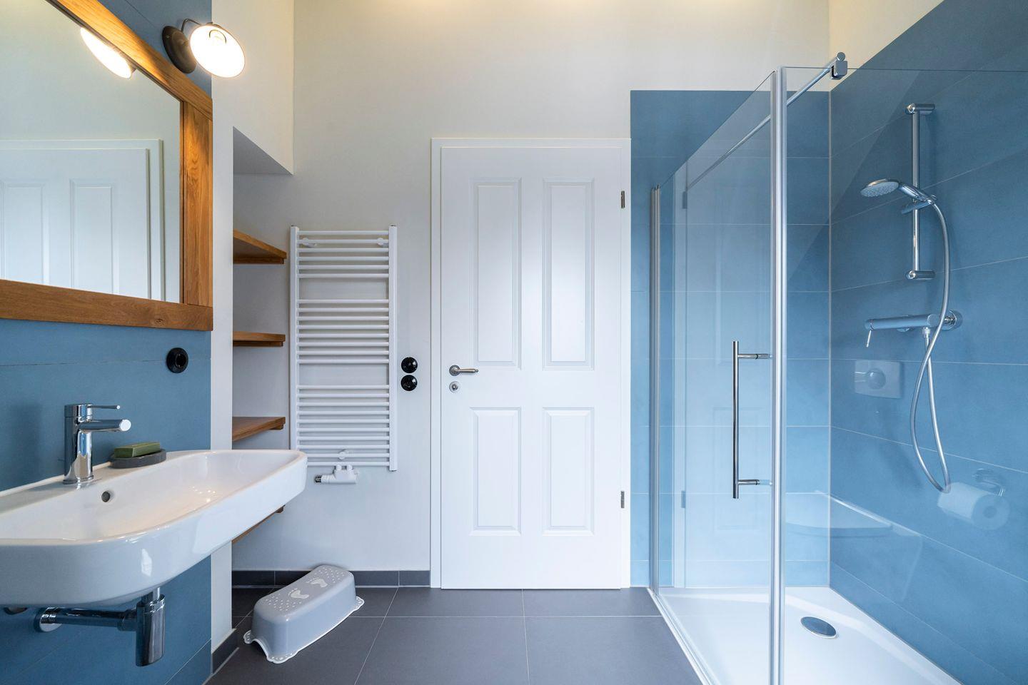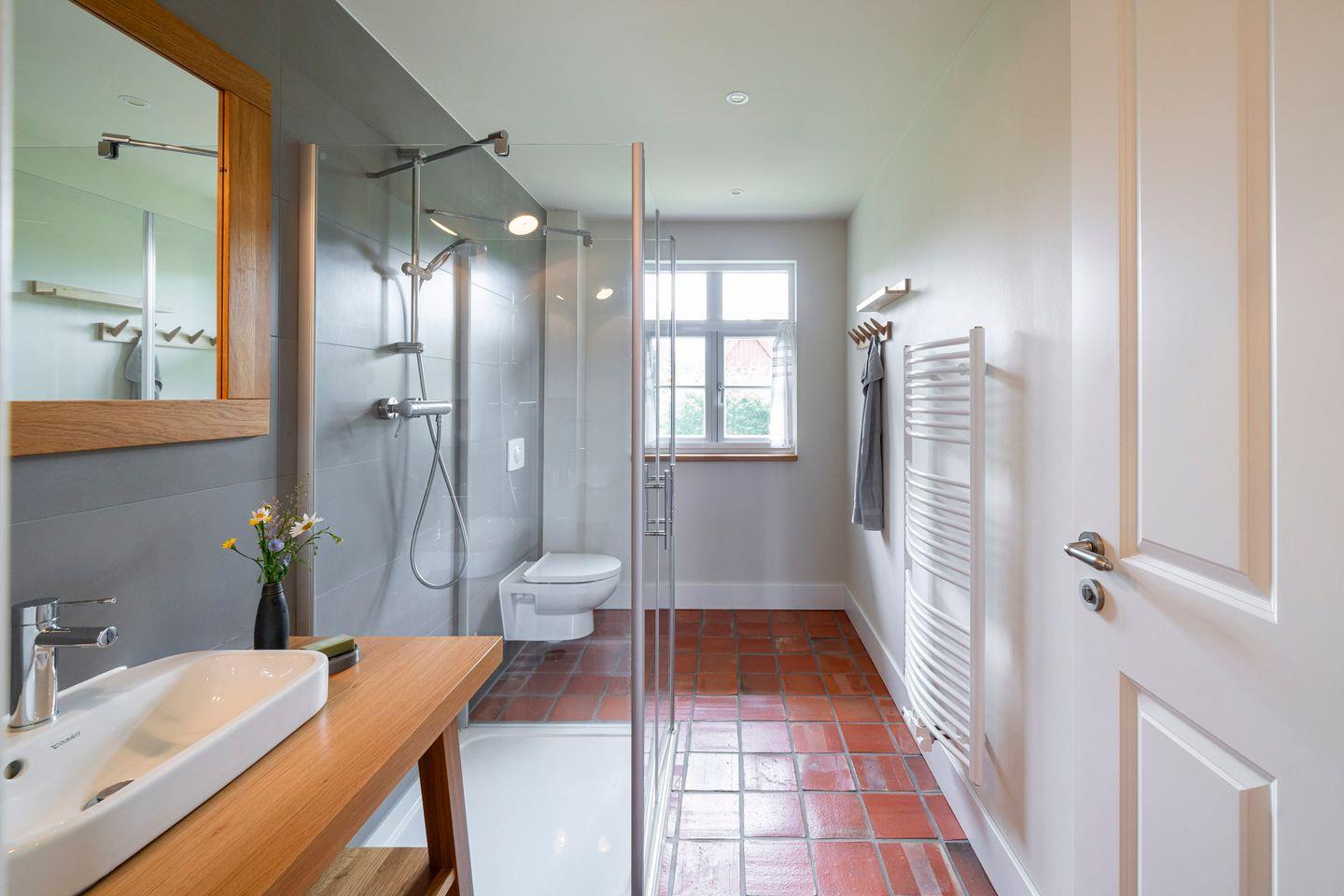 Das Erdgeschoss wird durch ein hochwertiges Badezimmer mit modernen Elementen abgerundet, darunter eine bodengleiche Glasdusche und Fußbodenheizung. Eine handgearbeitete Eichentreppe führt Sie ins Dachgeschoss mit offener Galerie. Hier erwarten Sie zwei Schlafzimmer mit komfortablen Boxspringbetten der Firma Ruf (180 cm breit, Härtegrade 2 und 3), sowie zwei weitere Schlafzimmer mit Einzel-Boxspringbetten (90 cm breit, Härtegrad 2). Ein zweites Badezimmer mit Badewanne, bodengleicher Glasdusche, WC und Waschtisch rundet dieses Geschoss ab, und bietet sowohl Komfort als auch Ästhetik. Für die kleinen Gäste steht außerdem ein schönes Holzbabybettchen und ein Kinderstuhl bereit.