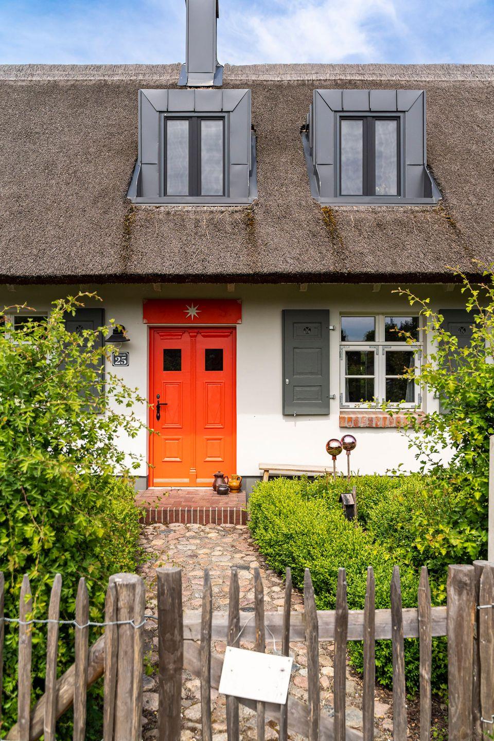 Beim Betreten des Landhauses Born spüren Sie sofort die reizvolle Atmosphäre. Das reetgedeckte Anwesen, nach historischem Vorbild neu errichtet, vereint meisterhaft alte Elemente mit zeitgemäßem Komfort. Im Erdgeschoss erwarten Sie eine geräumige Eingangsdiele und der großzügige Wohnbereich mit voll ausgestatteter ALNO-Küche, ideal zum Kochen und Verweilen. Der große Holztisch bietet Platz für gesellige Abende mit Familie und Freunden. Von hier aus gelangen Sie auch auf die sonnige Südterrasse, wo Sie entspannen können.