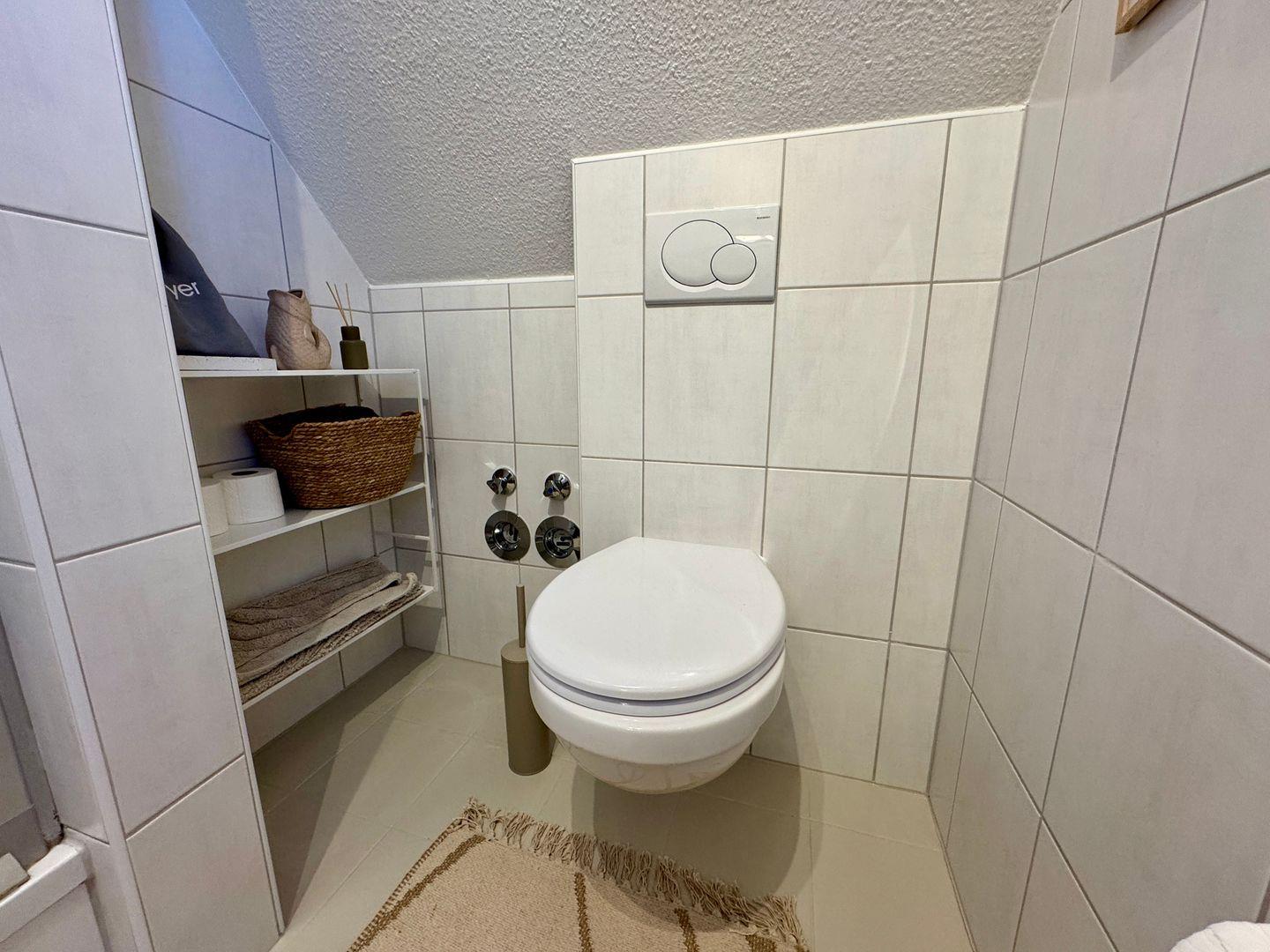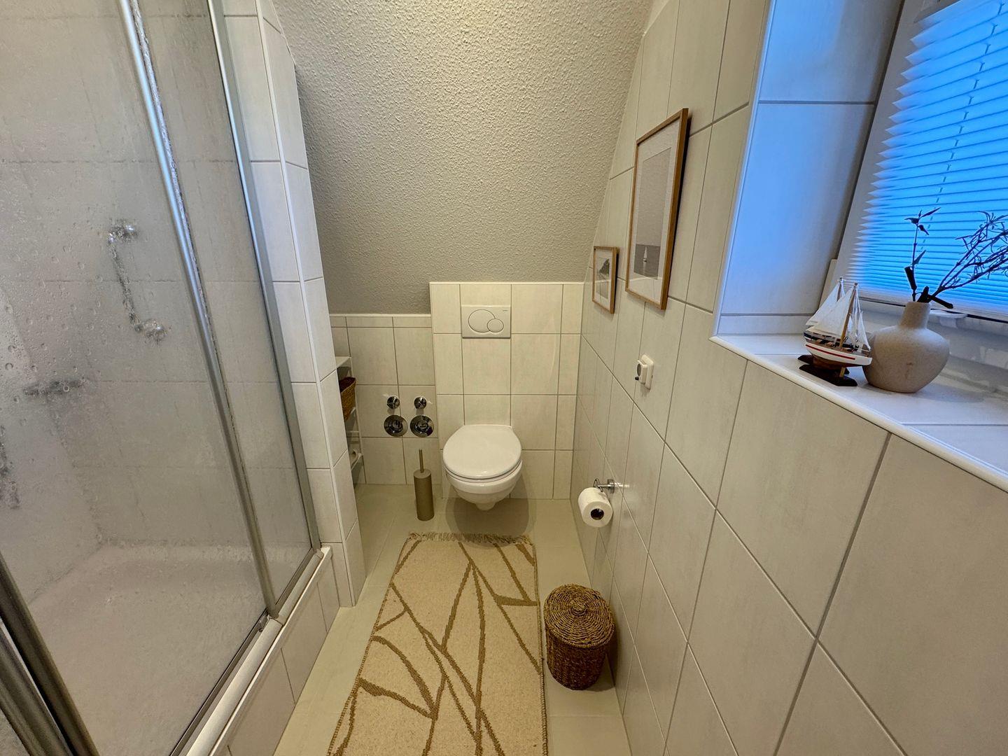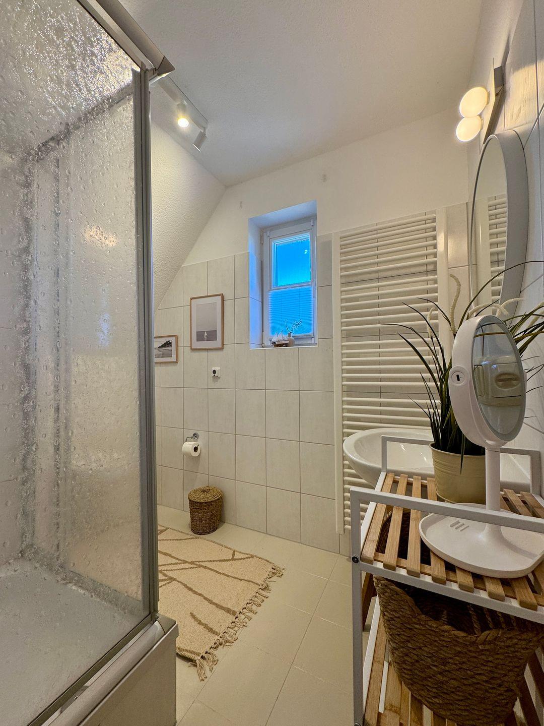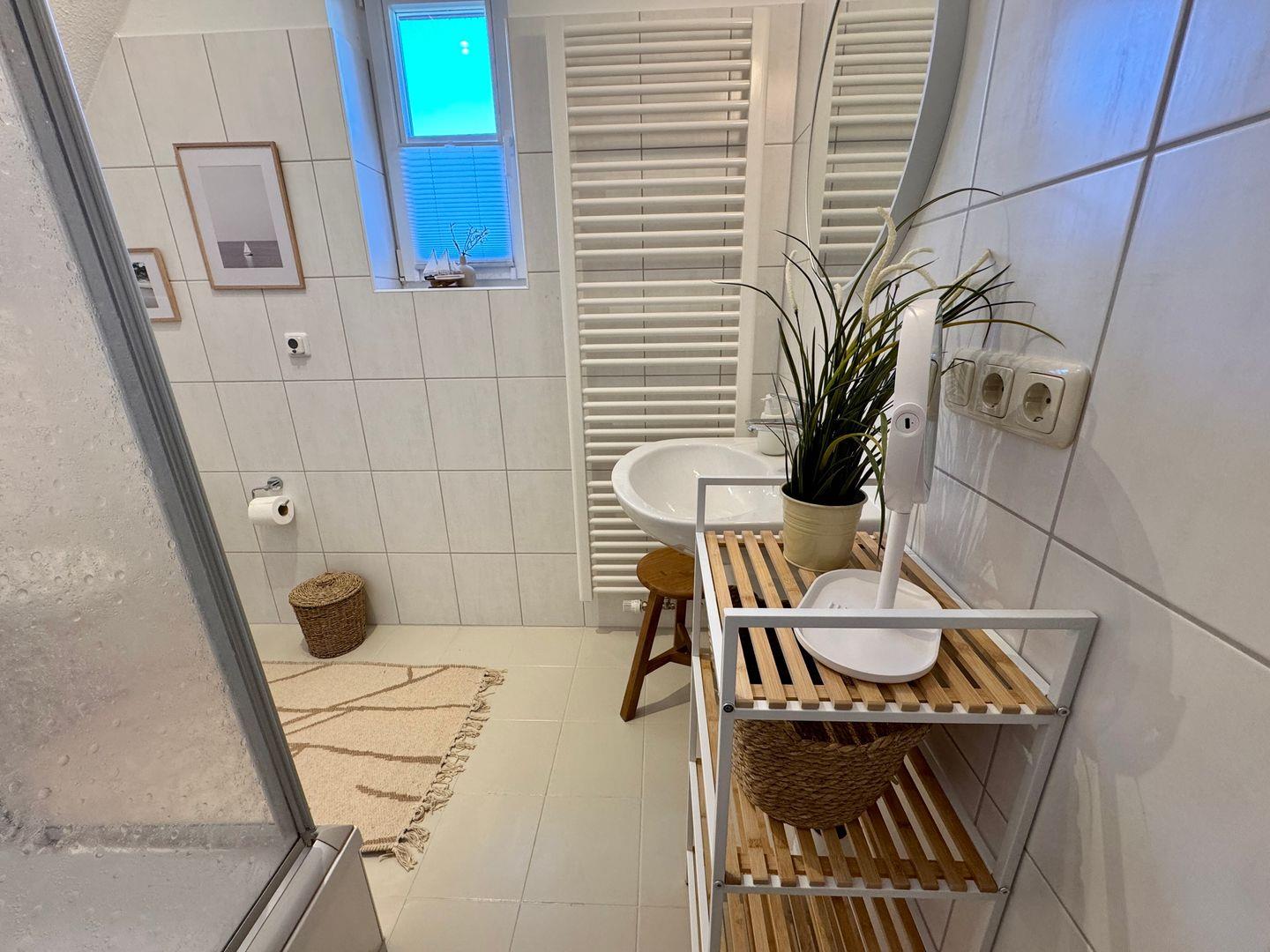 Das Badezimmer verfügt über Dusche, WC, Waschbecken, Fenster und Haartrockner und bietet zeitgemäßen Komfort.