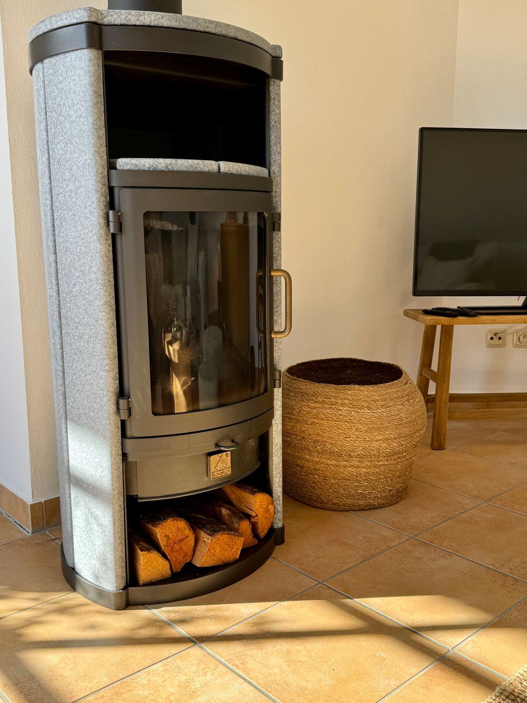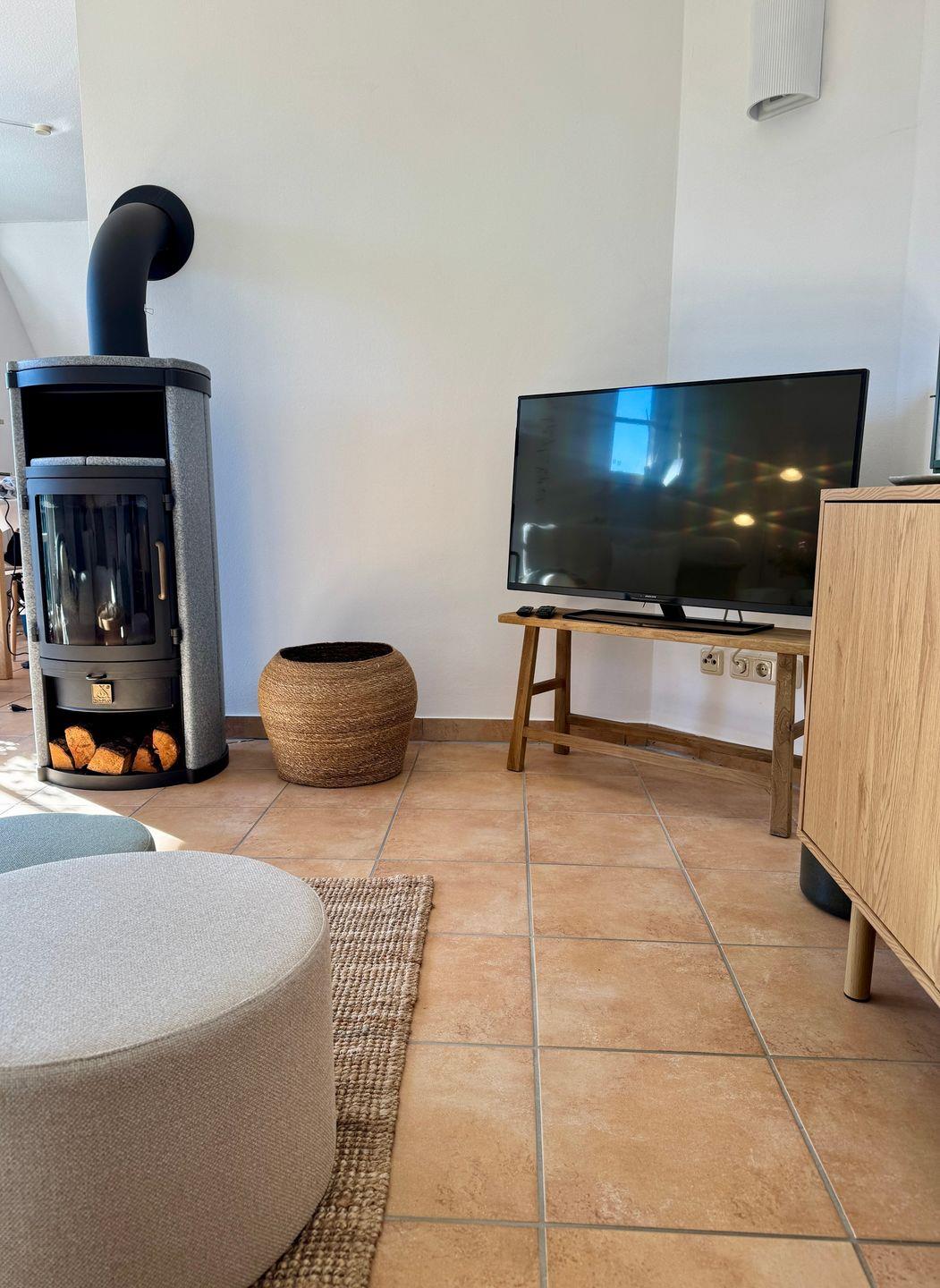 Der helle Wohnbereich lädt mit einer gemütlichen Sofaecke zum Verweilen ein. Besonders an kühleren Tagen sorgt der Kaminofen für eine wohlige Wärme und eine behagliche Atmosphäre – perfekt für entspannte Abende nach einem Tag in der Natur.