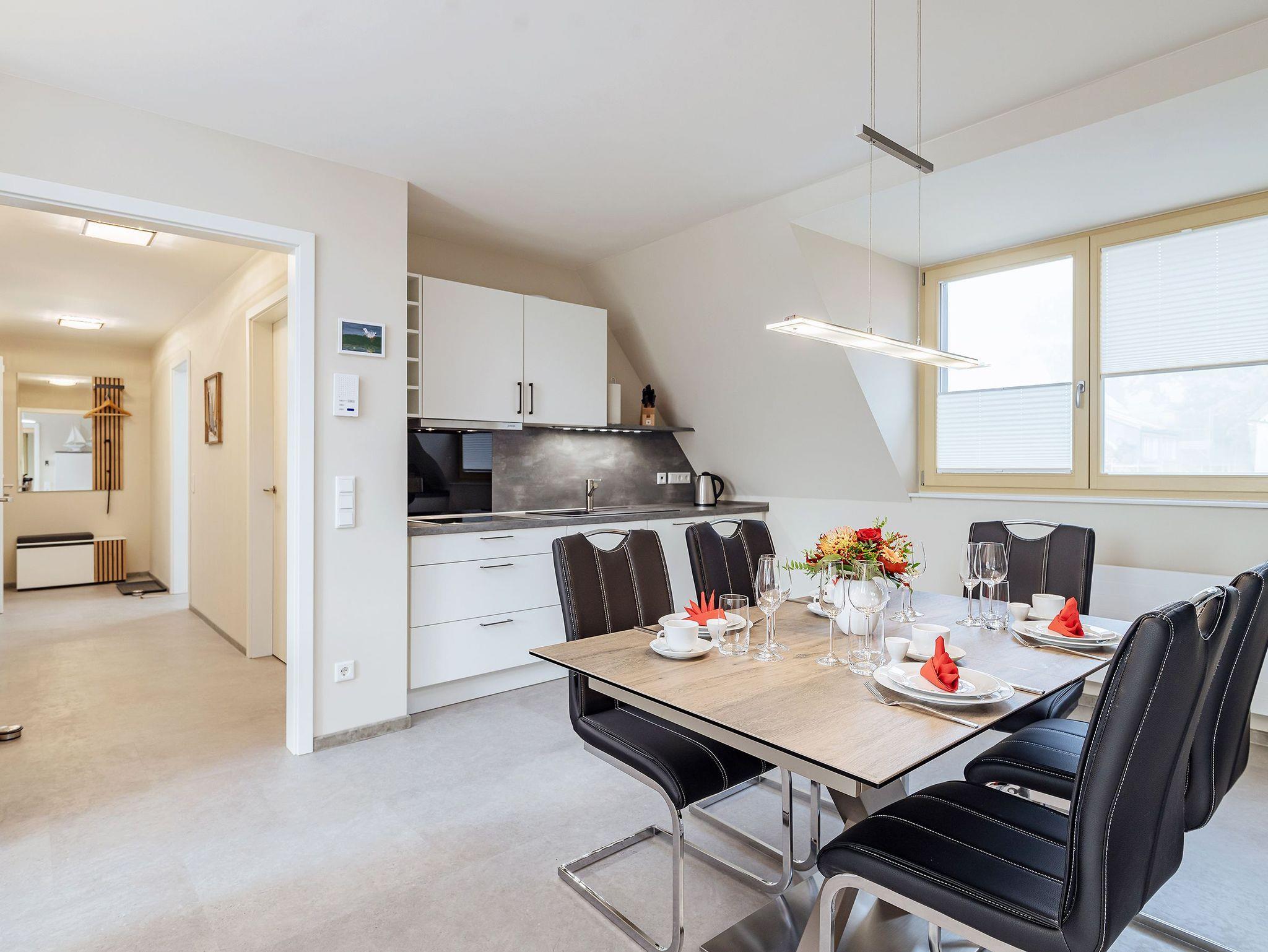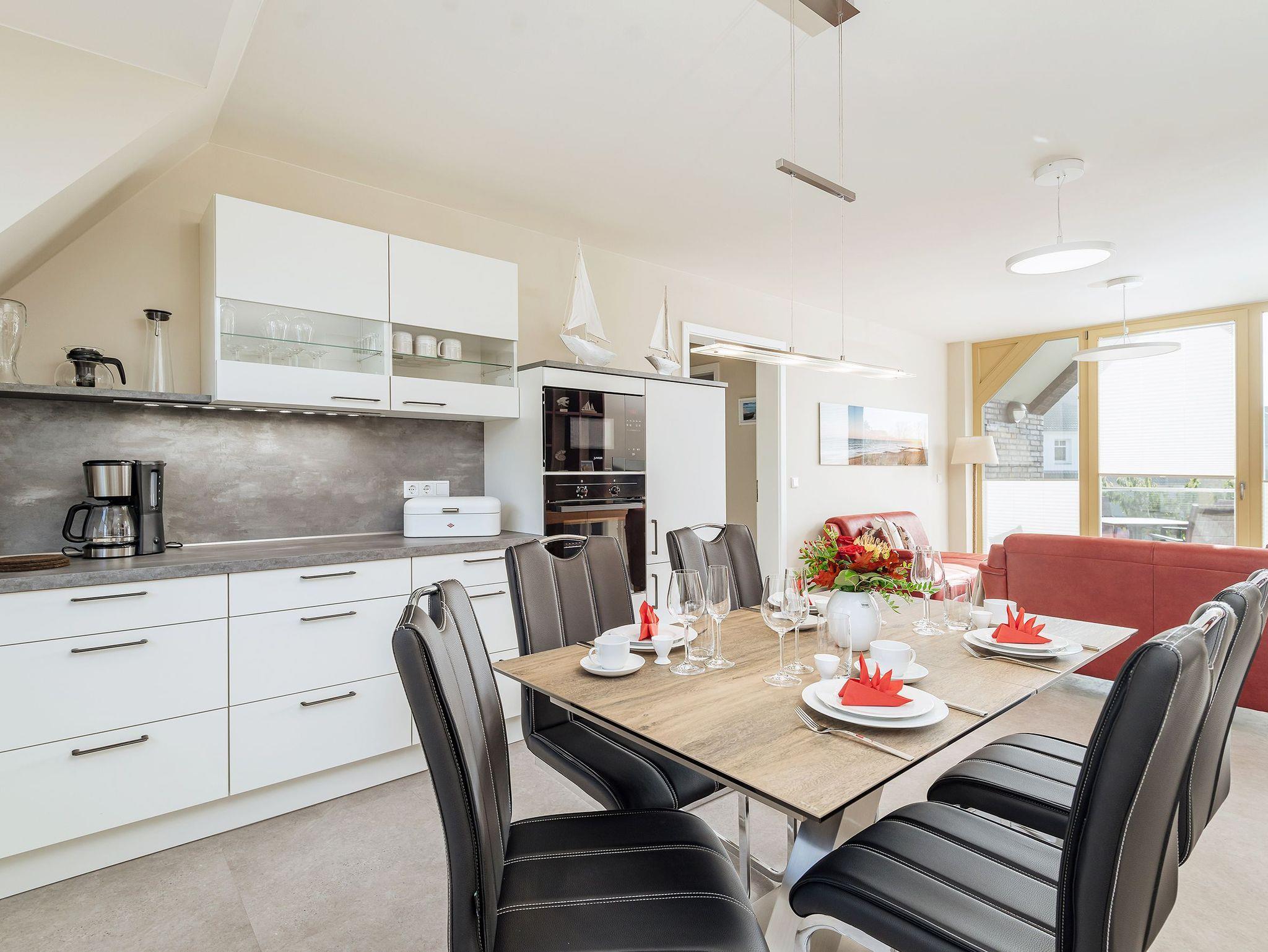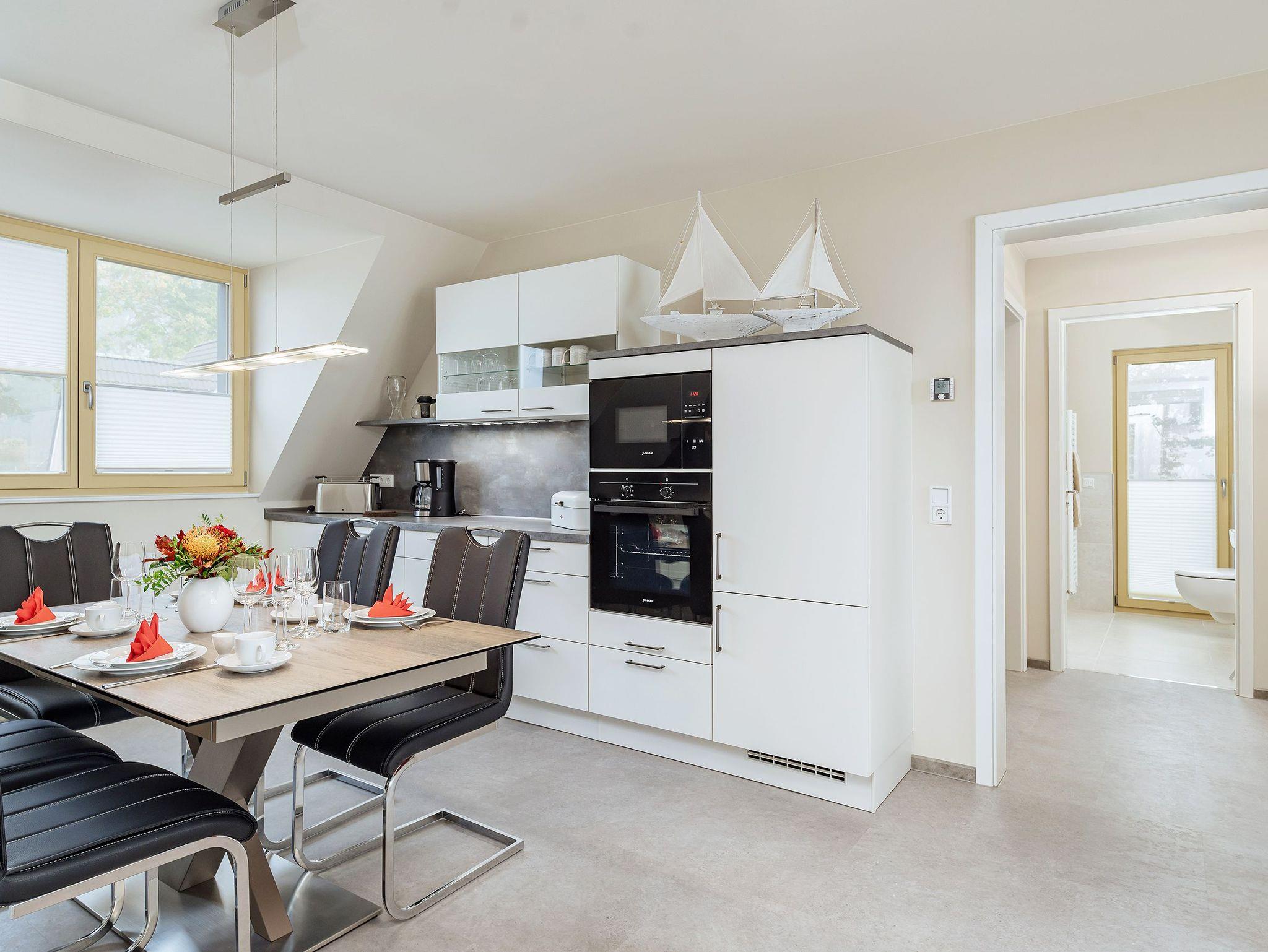 Der helle, offene Wohn- und Küchenbereich lädt zum gemeinsamen Kochen, Essen und Entspannen ein. Die moderne Einbauküche ist bestens ausgestattet ? mit allem, was das Hobbykoch-Herz höherschlagen lässt: Ceranfeld, Backofen, Mikrowelle, Geschirrspüler und hochwertige Utensilien von Zwilling. Und falls es doch mal ein bisschen zu ambitioniert wird ? die Spülmaschine ist auf Eurer Seite. Für ruhigere Momente gibt es eine gemütliche Schreib- und Leseecke ? ideal für ein gutes Buch, Urlaubsplanung oder das gepflegte „Ich tu mal so, als wäre ich produktiv“.