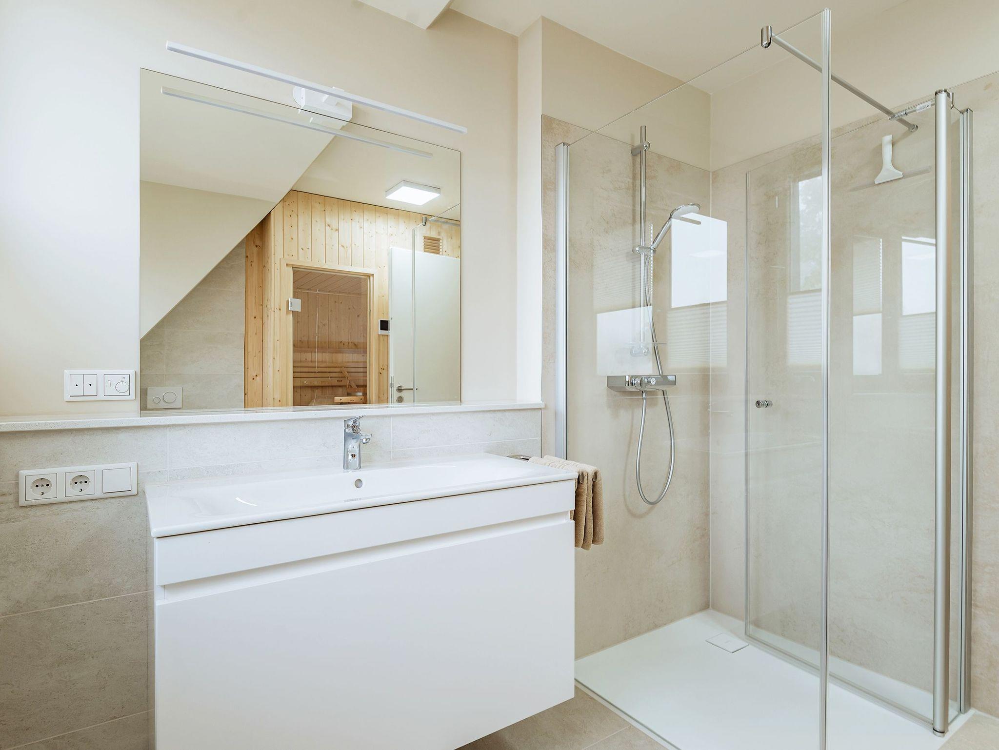 • Tageslichtbad mit elektr. Fußbodenheizung, ebenerdiger Dusche, großer Waschtisch, Handtuchheizkörper und Sauna
