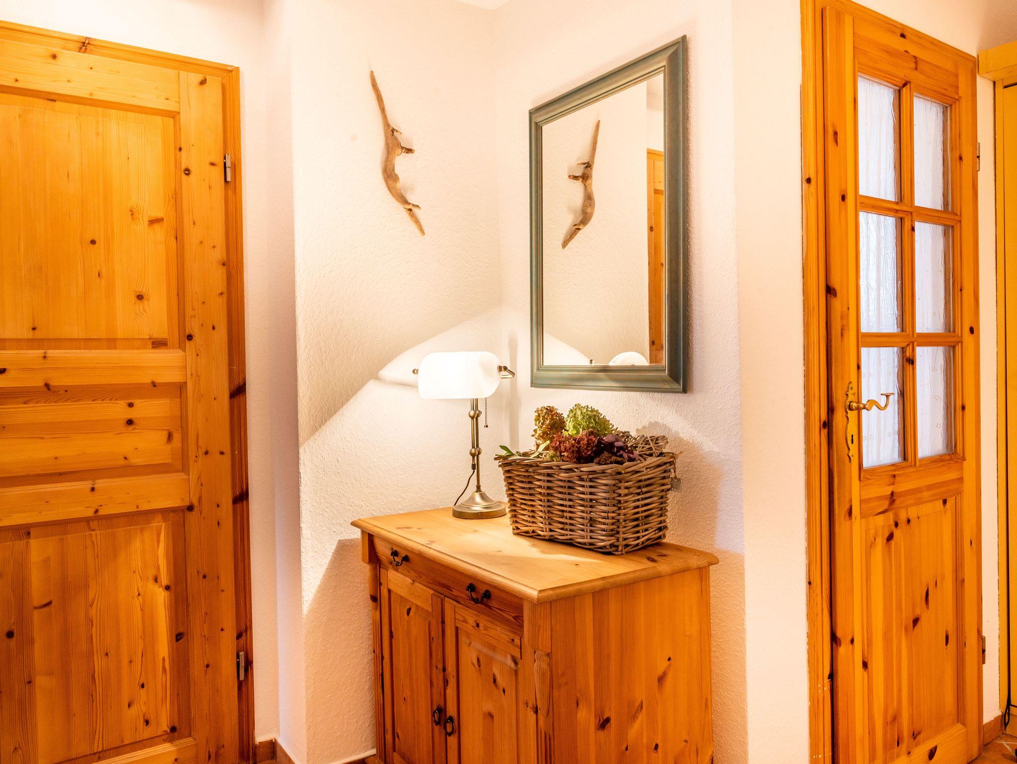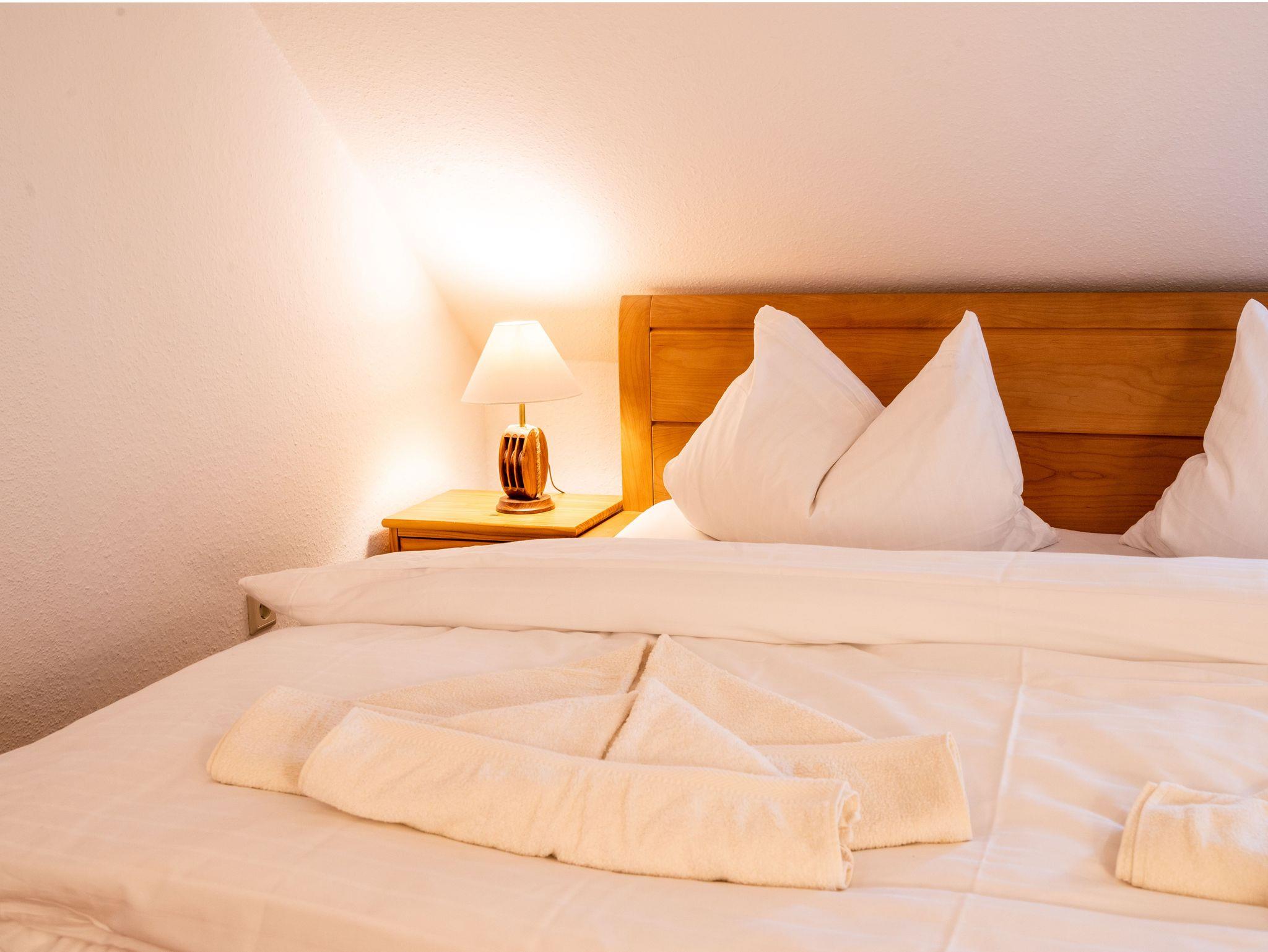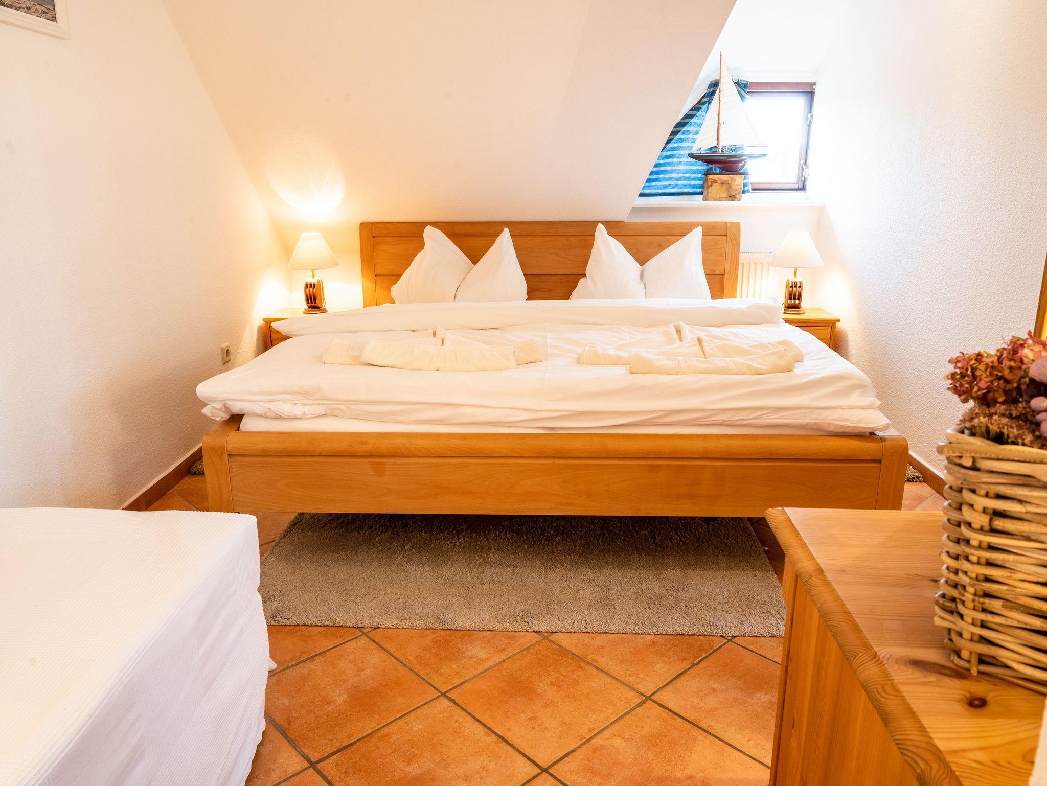 Das separate Schlafzimmer verfügt über ein Echtholzdoppelbett mit hochwertigen Naturmatratzen aus Rosshaar und Schafwolle sowie einem Bonnell Federkern, die für ein angenehmes Schlafklima sorgen. Für eine dritte Person steht im Schlafzimmer ein zusätzliches Einzelbett zur Verfügung. Ein großer Kleiderschrank in der Dachschräge sowie eine Echtholzkommode bieten ausreichend Stauraum.