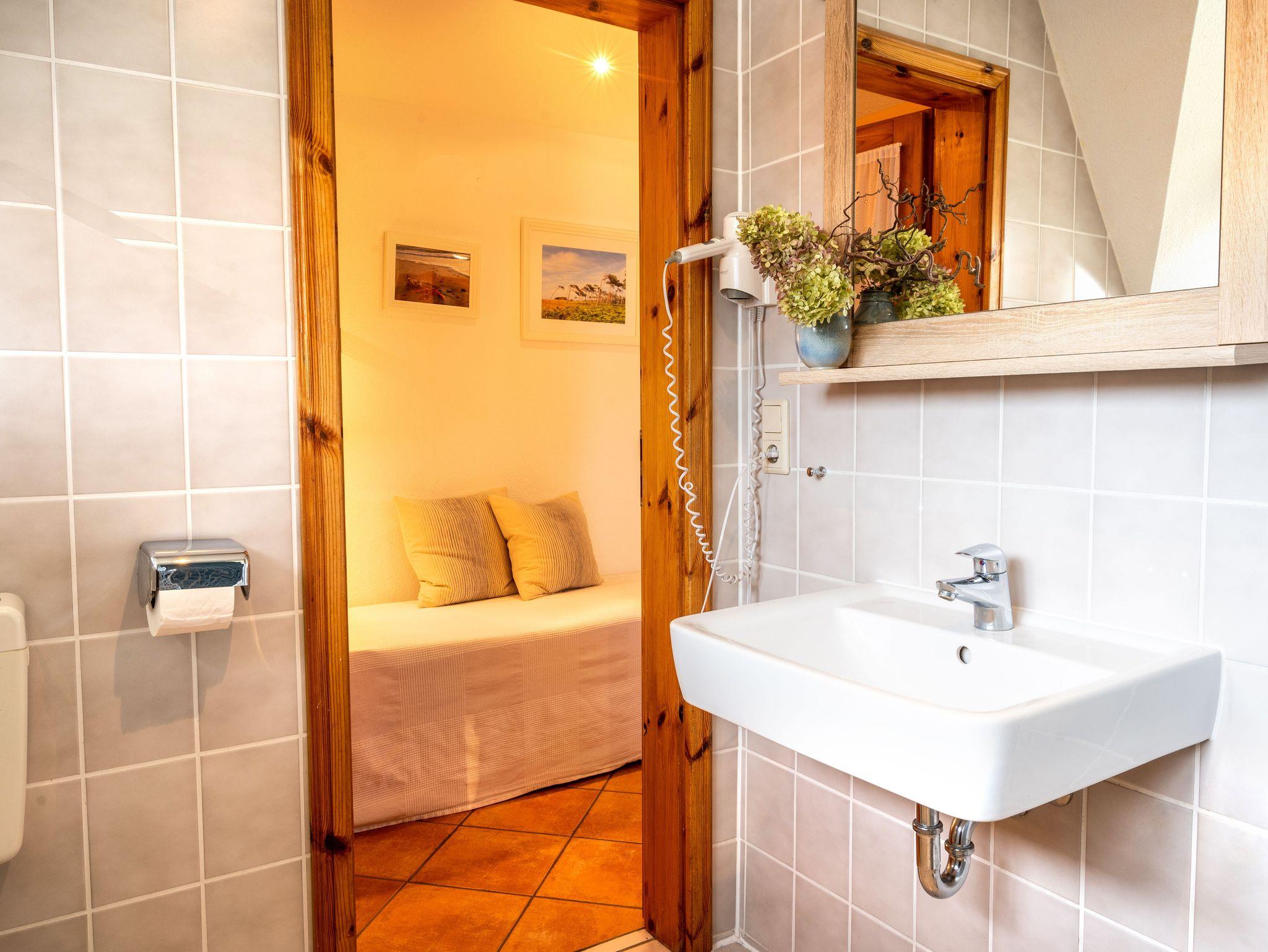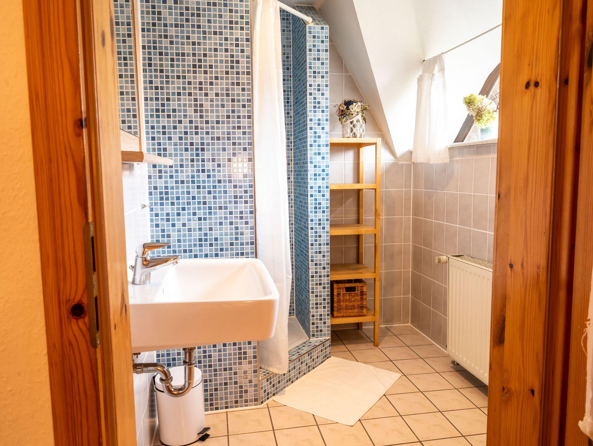 Das Badezimmer ist mit Dusche, Waschbecken und WC ausgestattet. Ein Haartrockner ist vorhanden. Durch das Fenster ergibt sich ein seitlicher Blick Richtung Bodden.