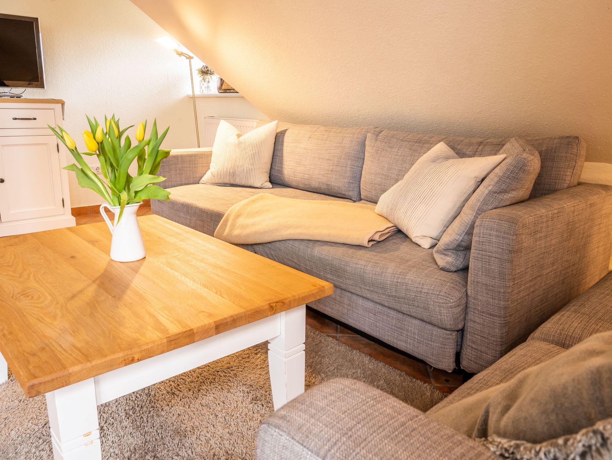 Der zentrale Wohnbereich kombiniert Wohnen, Essen und Kochen in einem offenen Raum. Hier befindet sich eine komfortable Eckcouch (seit 2026), die zum Entspannen einlädt. Eine Schlafmöglichkeit im Wohnzimmer gibt es nicht. Ein Esstisch mit Platz für bis zu vier Personen verbindet den Wohnbereich mit der vollständig ausgestatteten Einbauküche. Zur Küchenausstattung gehören unter anderem Ceranfeld, Backofen, Geschirrspüler, Kühlschrank mit Gefrierfach, Filterkaffeemaschine, Kapselmaschine, Wasserkocher und Toaster. Ein besonderes Ausstattungsmerkmal ist die Maunawai Hausfilteranlage, durch die Gäste jederzeit frisch gefiltertes und mineralisiertes Trinkwasser direkt aus dem Wasserhahn genießen können.