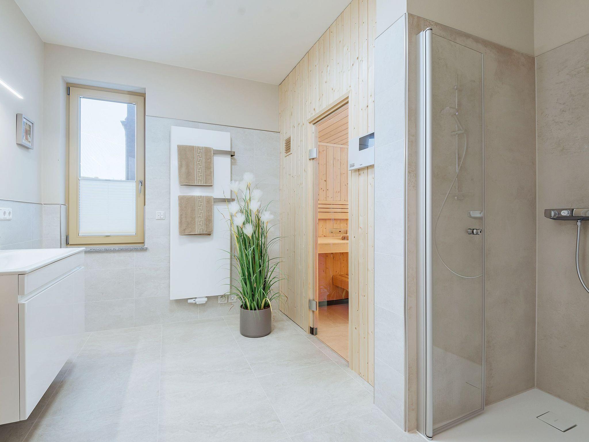 • Tageslichtbad mit elektr. Fußbodenheizung, ebenerdiger Dusche, großer Waschtisch, Handtuchheizkörper und Sauna