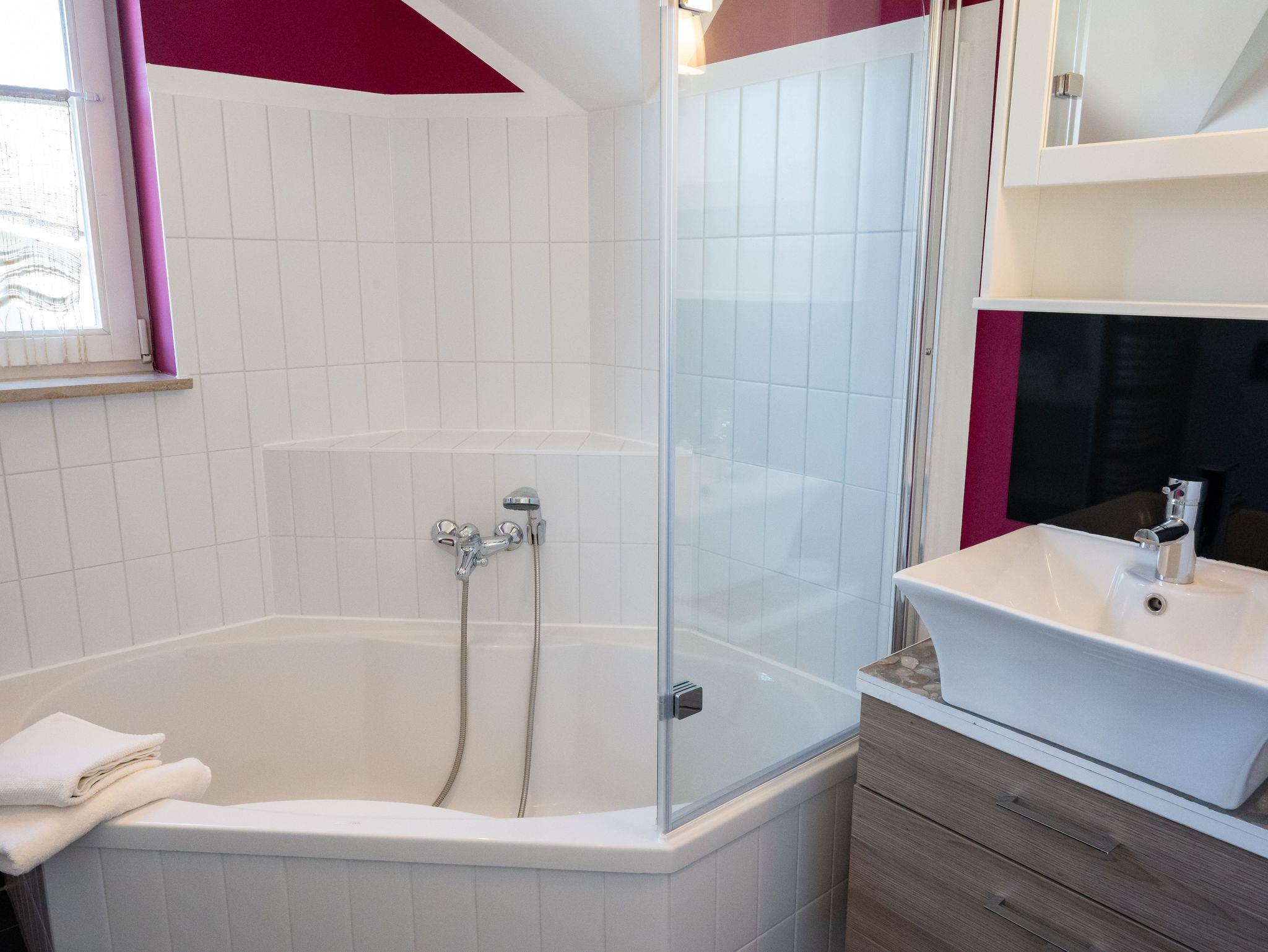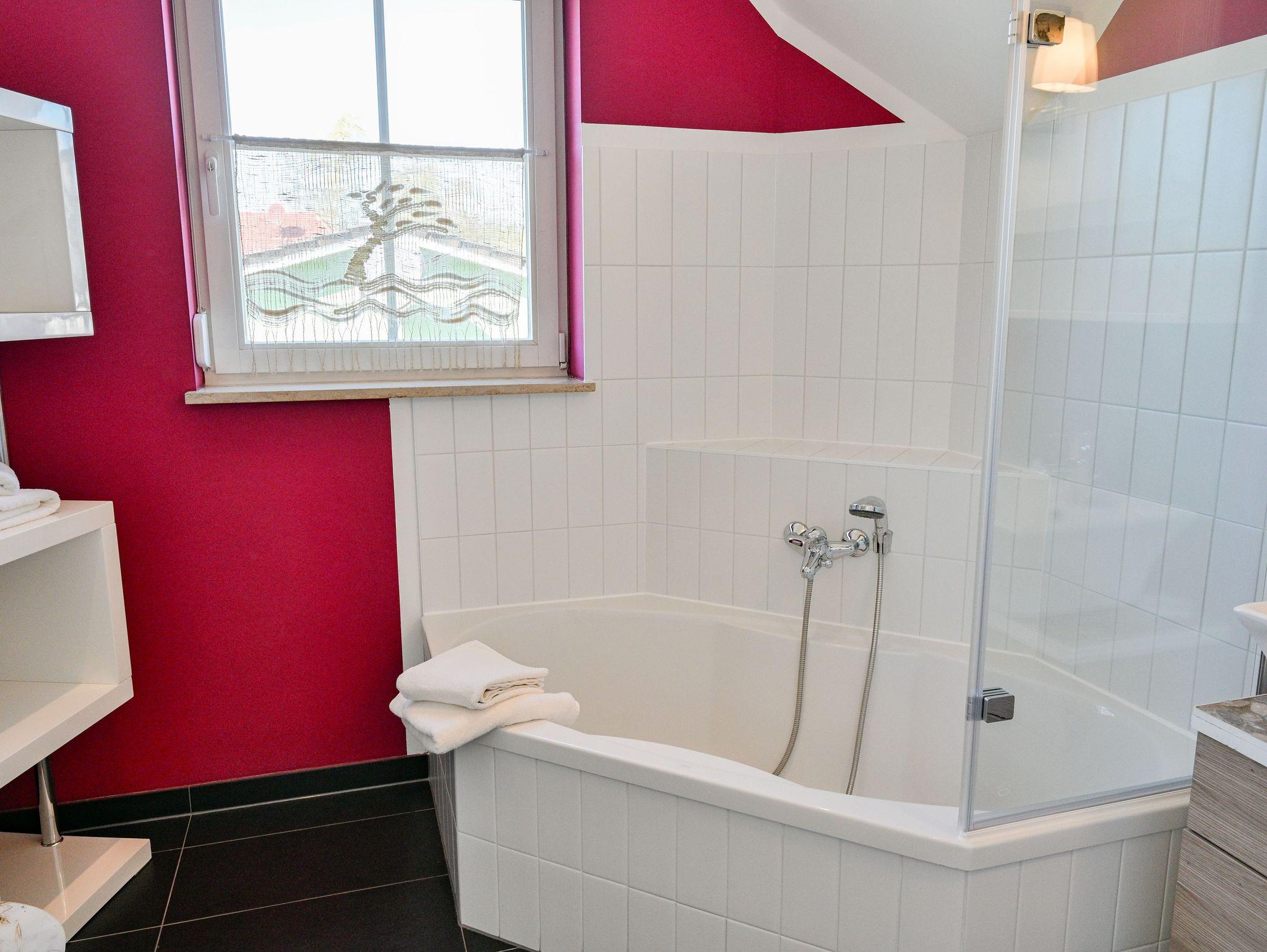 Das Badezimmer ist hell und funktional ausgestattet und verfügt über eine Badewanne mit integrierter Duschmöglichkeit. Eine praktische Duschtrennwand ermöglicht komfortables Duschen in der Badewanne. Zusätzlich stehen ein WC sowie ein Handtuchtrockner zur Verfügung. Das Fenster sorgt für natürliches Licht und eine angenehme Belüftung des Raumes.