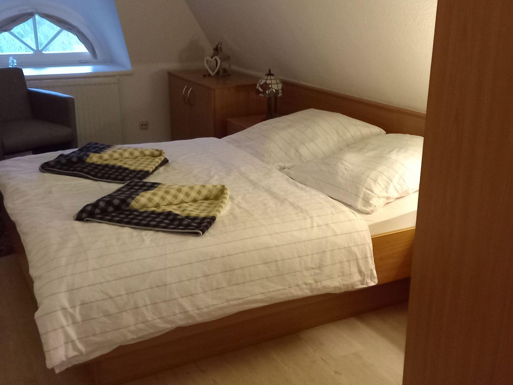Im Dachgeschoss liegt das Schlafzimmer mit Doppelbett und getrennten Matratzen. Direkt vom Schlafzimmer aus erreichbar ist ein separates WC. Zusätzlich steht ein großes Badezimmer im EG mit Dusche und Waschmaschine zur Verfügung.