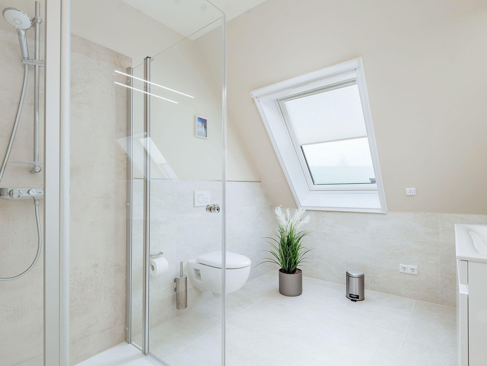 Das Tageslichtbad überzeugt mit großem Waschtisch, Handtuchheizkörper, elektrischer Fußbodenheizung und ebenerdiger Dusche ? hier startet Ihr entspannt in den Tag oder lasst ihn gemütlich ausklingen.