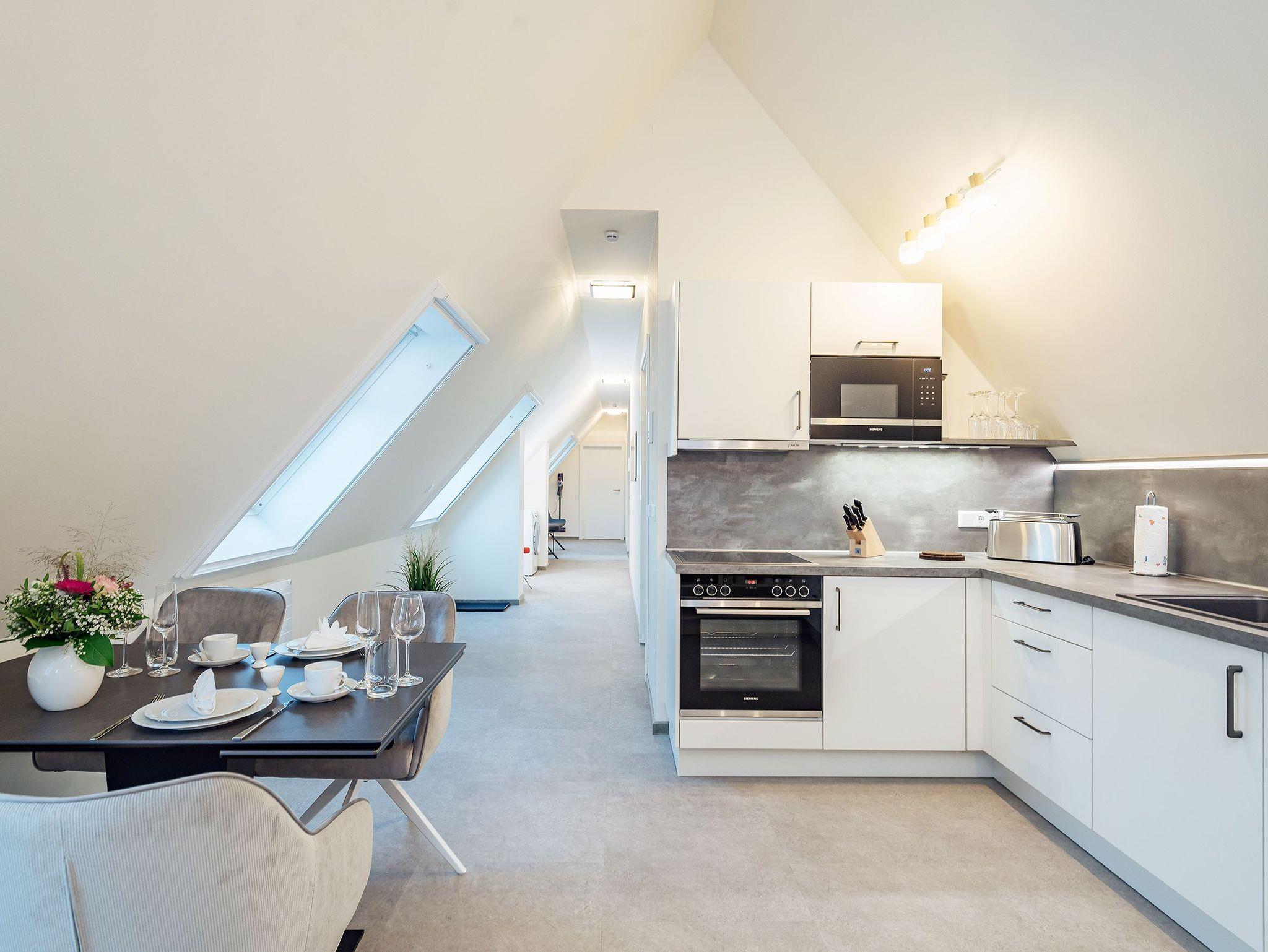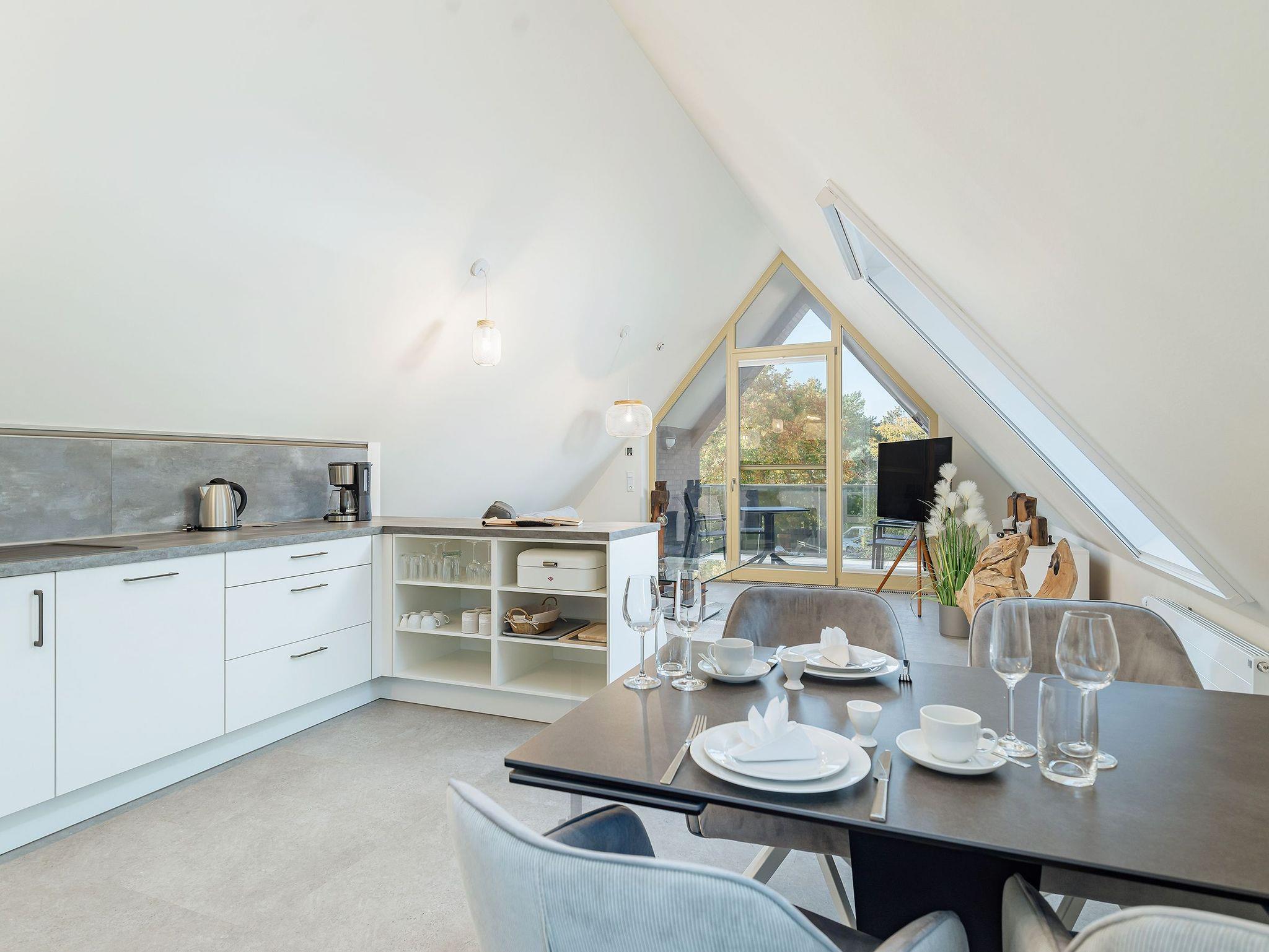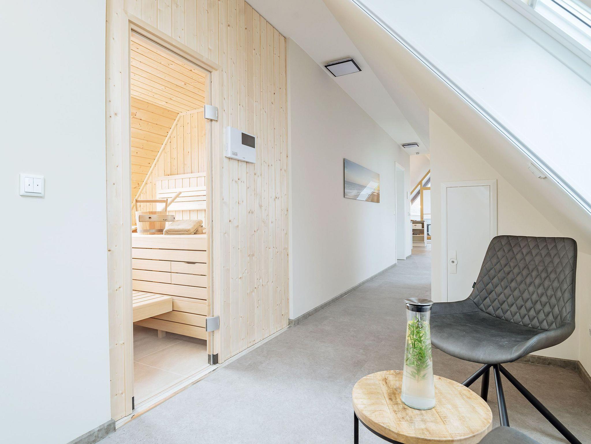 Das Tageslichtbad lässt keine Wünsche offen: großer Waschtisch, ebenerdige Dusche, Fußbodenheizung und Handtuchheizkörper sorgen für Komfort. Das absolute Highlight ist jedoch die Sauna mit Blick Richtung Bodden ? besser lässt sich Entspannung kaum verpacken. Auch die Küche kann sich sehen lassen: modern ausgestattet mit Ceranfeld, Backofen, Mikrowelle und Geschirrspüler sowie allem, was dazugehört. Hochwertige Kochutensilien von Zwilling und stilvolles Geschirr machen aus jedem Gericht ein kleines Urlaubserlebnis ? egal ob Sterne-Menü oder schnelle Pasta.