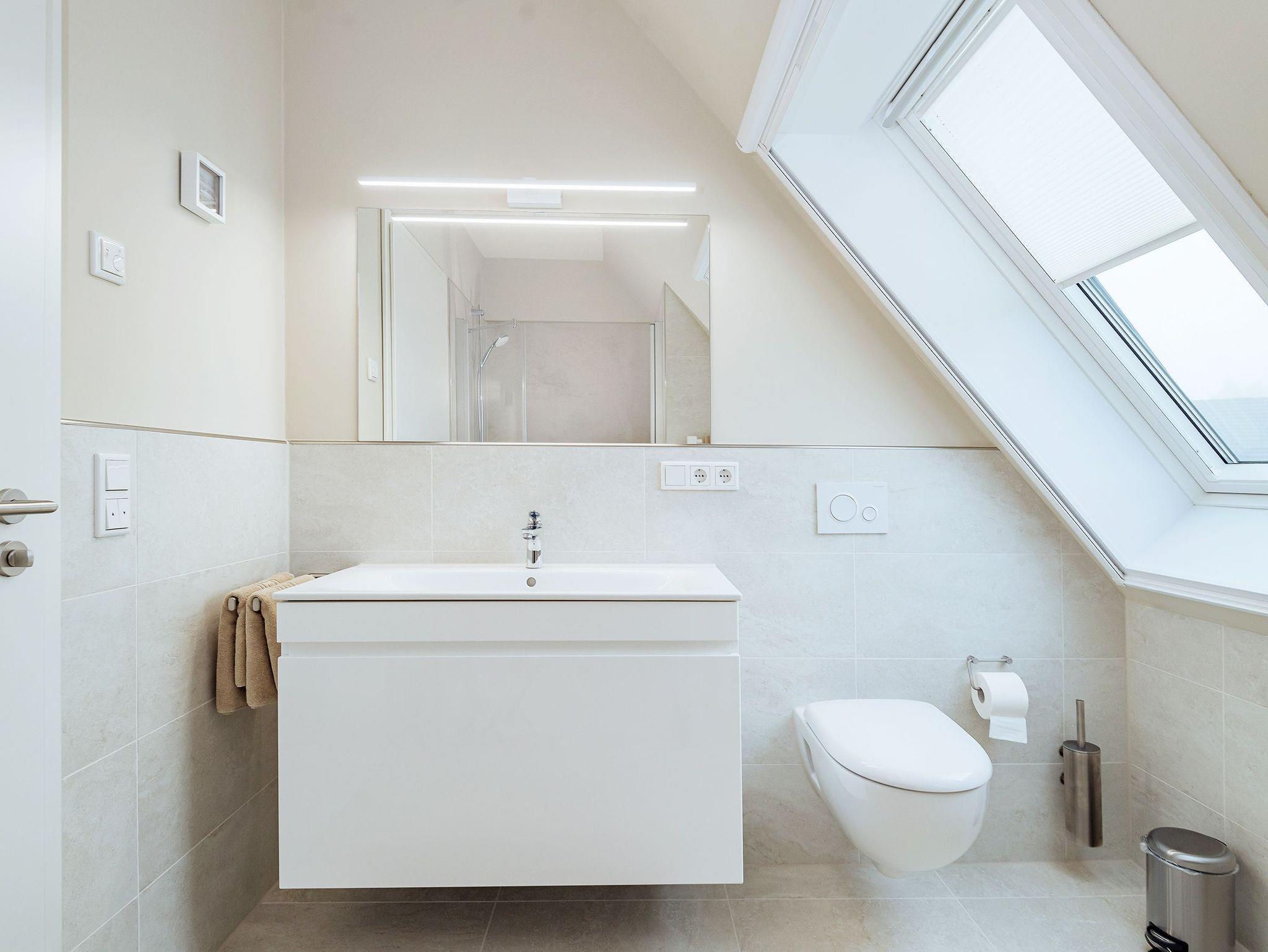 • Bad mit elektr. Fußbodenheizung, ebenerdiger Dusche, großer Waschtisch