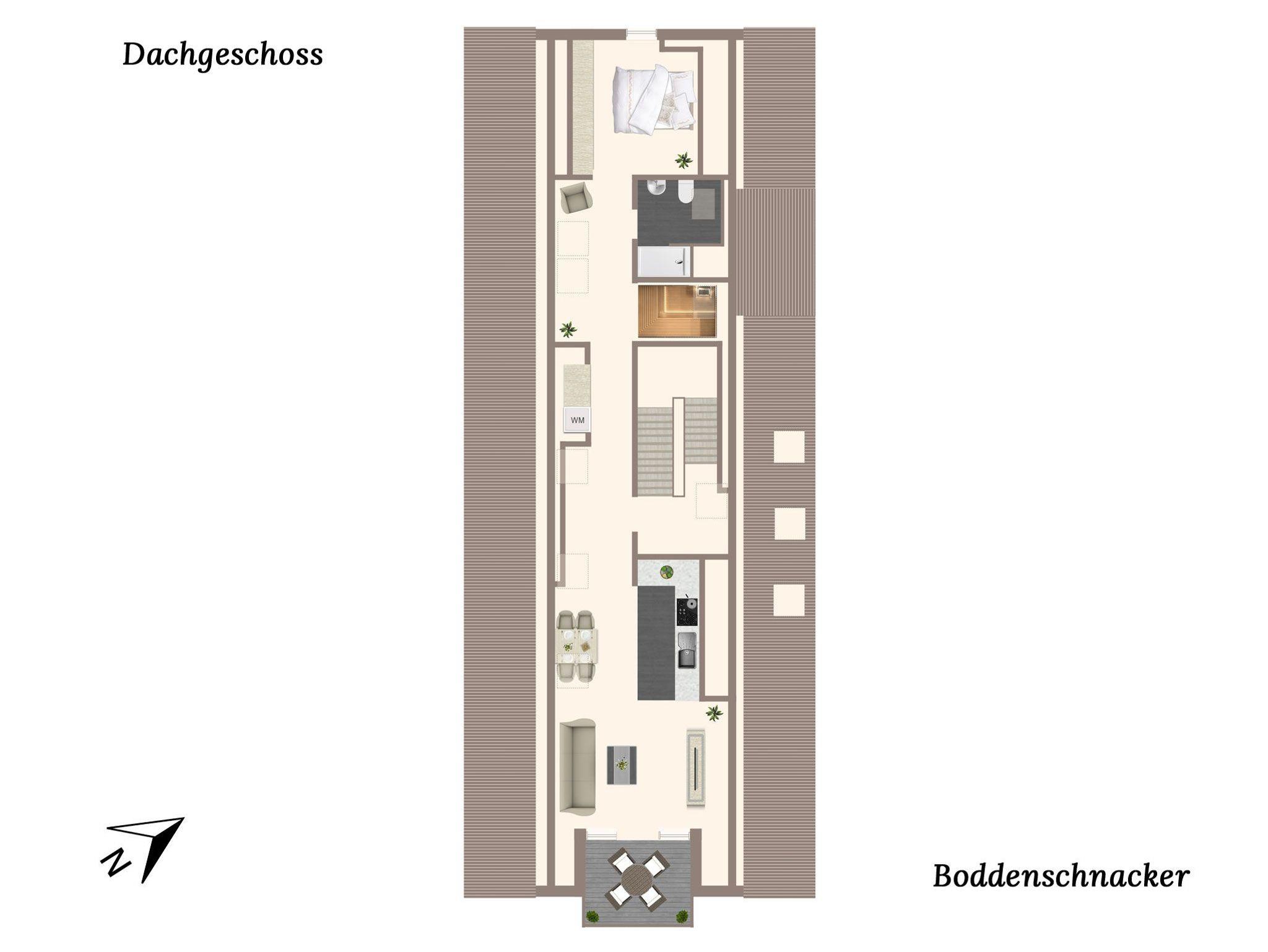 Willkommen im „Boddenschnacker“ ? hier wird nicht nur geschnackt, sondern vor allem entspannt! Im Dachgeschoss eines neu gebauten Areals gelegen, bietet diese stilvolle Ferienwohnung auf 83 m² den perfekten Rückzugsort für zwei Personen. Das gemütliche Schlafzimmer mit seinem komfortablen Boxspringbett (2,00 m x 1,80 m) sorgt für erholsame Nächte ? ideal, um nach einem Tag an der frischen Luft tief und fest zu schlafen… oder morgens einfach noch ein bisschen liegen zu bleiben. Schließlich hat man ja Urlaub.Der helle, offene Wohn- und Küchenbereich mit Balkon in Westausrichtung ist wie gemacht für entspannte Stunden. Hier genießt Ihr die Abendsonne ? ob beim Essen, einem Glas Wein oder beim philosophischen „Boddenschnack“.