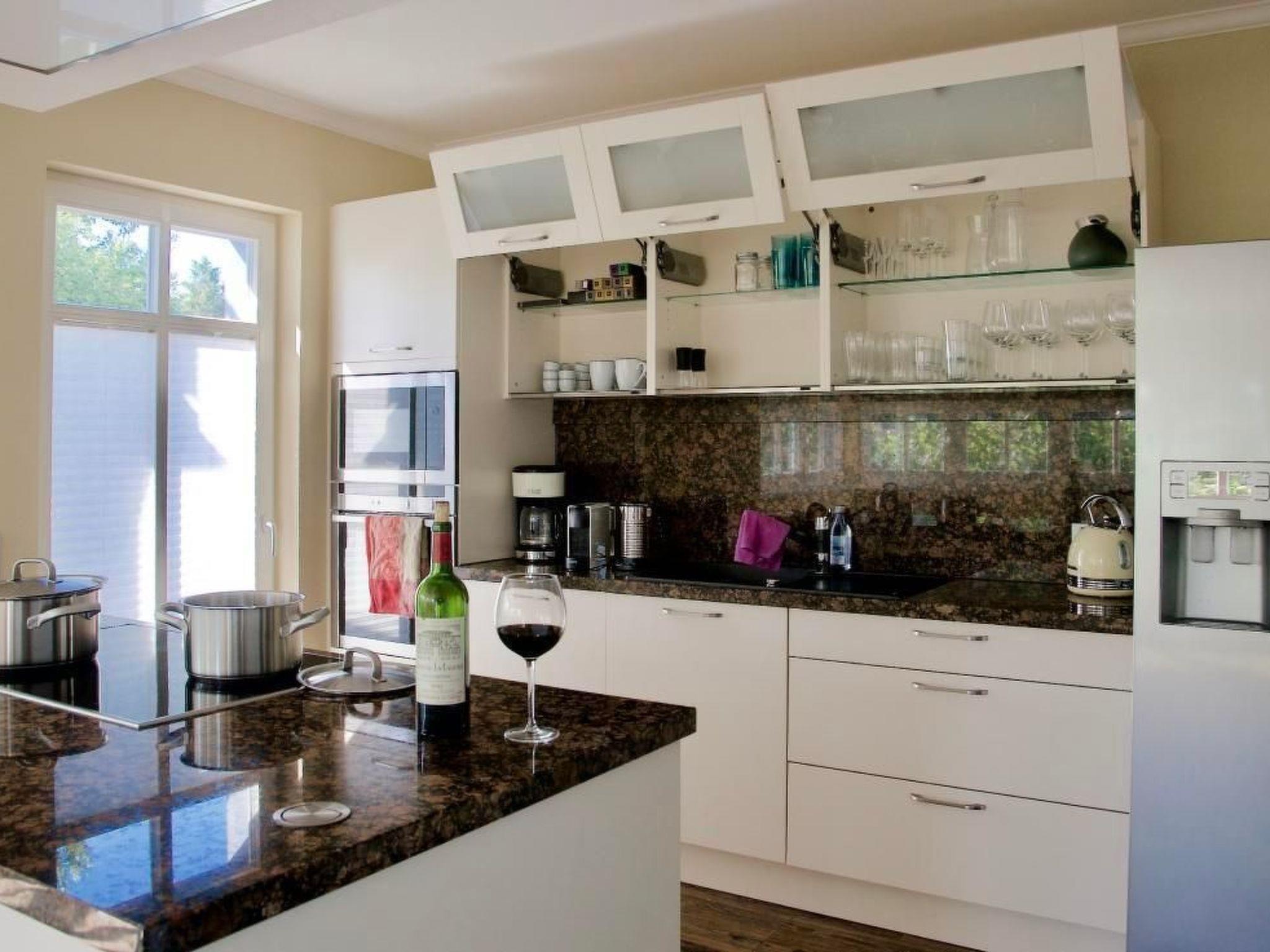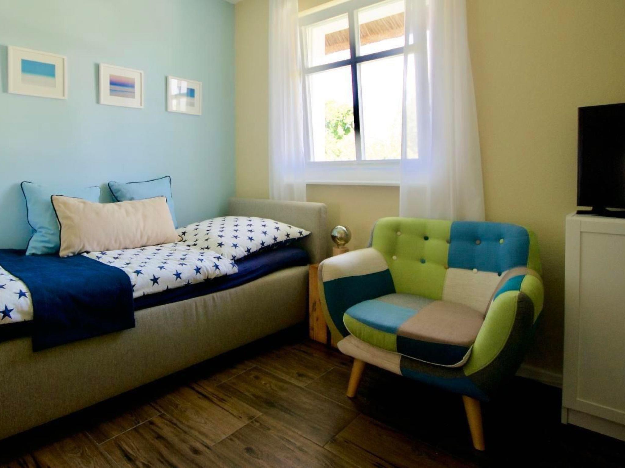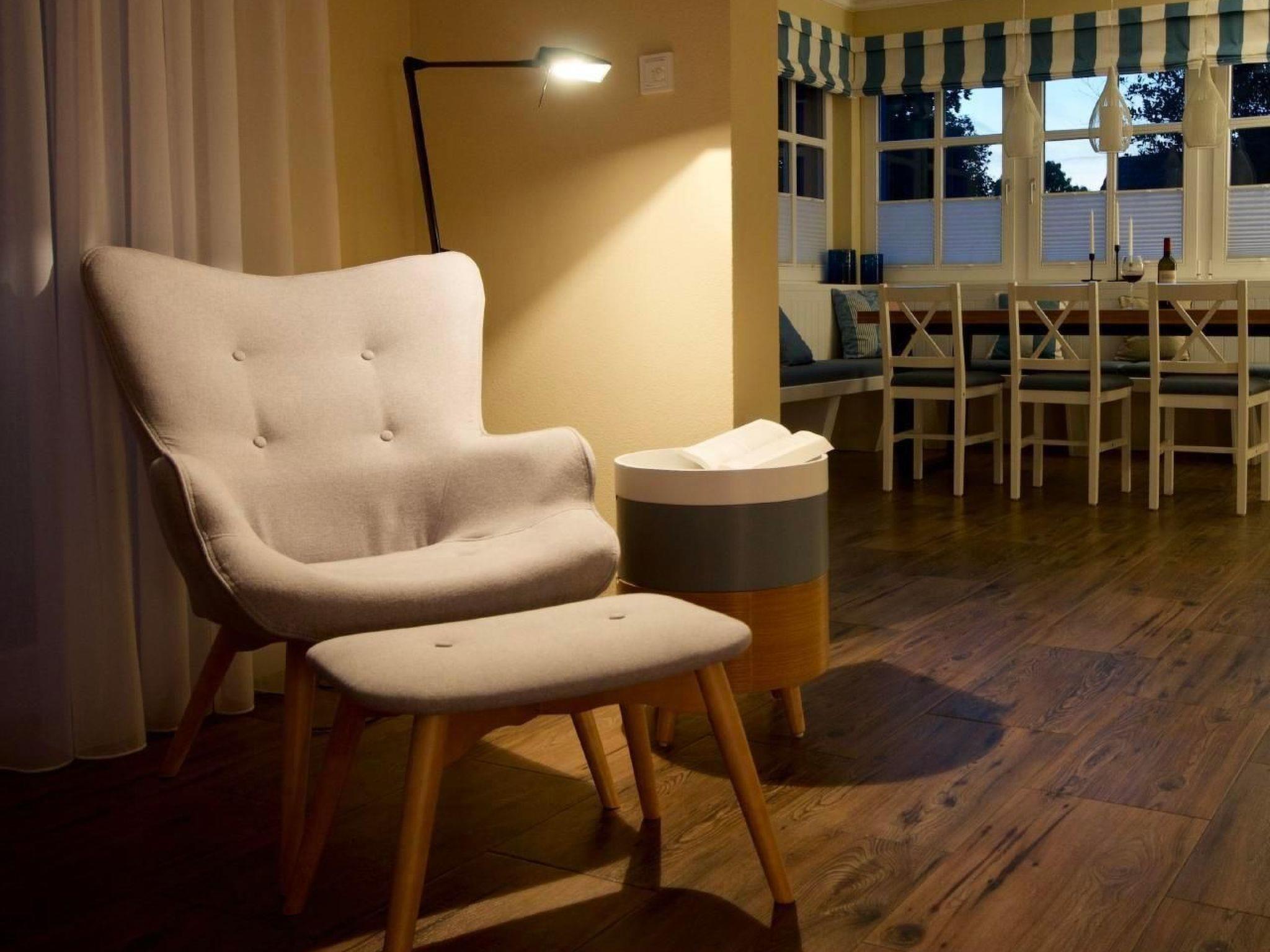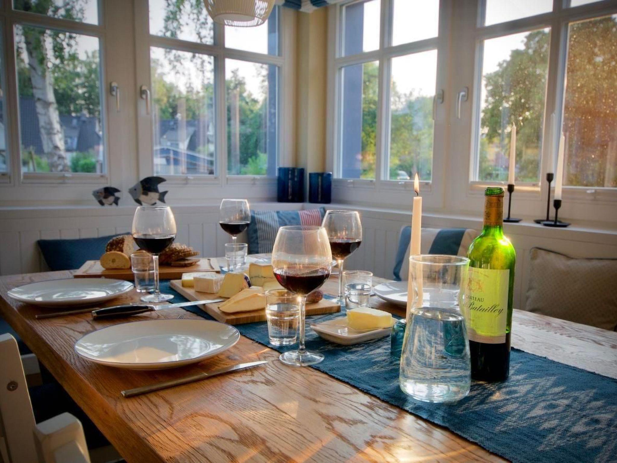 Haus Meerblau was built in the style of a traditional Darß captain's house with a thatched roof and converted into an exclusive holiday home in 2018 with great attention to detail. Since autumn 2019, a spacious sauna and wellness house has been part of the ensemble. Haus Meerblau pampers up to 6 people with every imaginable comfort and high-quality furnishings - with a fireplace and underfloor heating, box-spring beds, a top-equipped kitchen with induction cooker and Nespresso machine, BOSE SoundTouch music system, WiFi, ... The spacious house with 170 m² of living space (35 m² of which is in the sauna and wellness house) offers space for a relaxing holiday on a 1100 m² south-west-facing plot. Whether you cook together in the modern kitchen, relax with a good book and a glass of wine in the armchair by the fireplace or on the cosy sofa, enjoy the view of the garden after a sauna session in the relaxation room, play games at the large dining table or in the garden - here you can relax undisturbed and unwind.