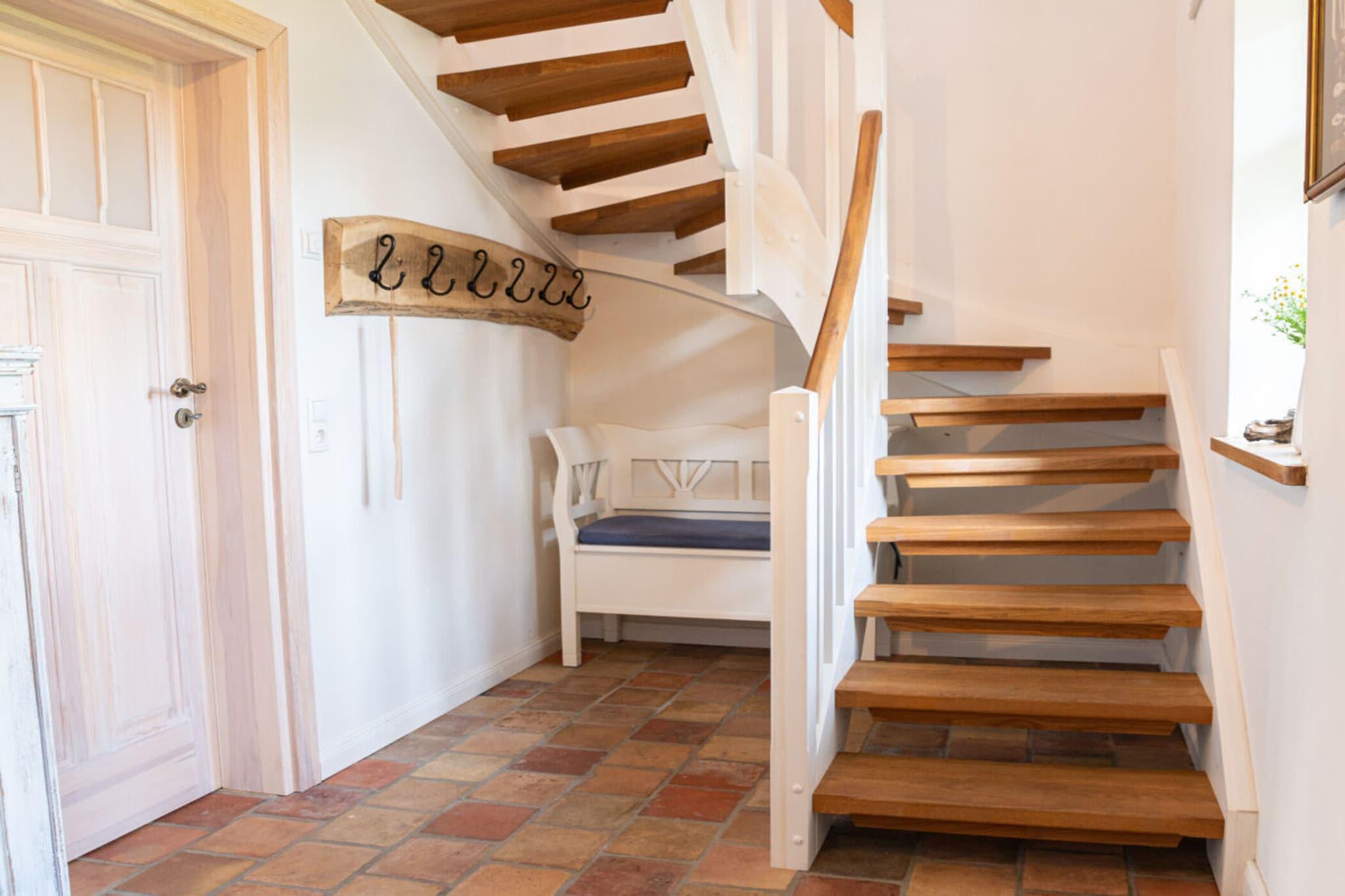 In diesem komfortablen neuen Ferienhaus ist viel Platz für bis zu 8 Personen auf zwei Etagen. Das Haus wurde ausschließlich aus ökologischen Naturbaustoffen in traditioneller darßtypischer Bauweise errichtet und ist im maritimen Ambiente eingerichtet. Das Haus wurde innen komplett mit Lehm verputzt und ist so besonders gesundheitsfördernd, da Lehmputz die Luftfeuchtigkeit ausgleicht und zusätzlich Schadstoffe aus der Luft aufnimmt. Es wartet auf Sie eine komplett ausgestattete große Küche, viele Rückzugsmöglichkeiten, ein Kamin, eine Sauna, hochwertige Geräte und Betten. Außenbereich: 900qm großen Garten inkl eigenen Kräutergarten, Saunahütte, zwei Terrassen und eine große Dachterrasse mit Panoramablick über den Garten auf die Pferdekoppel.